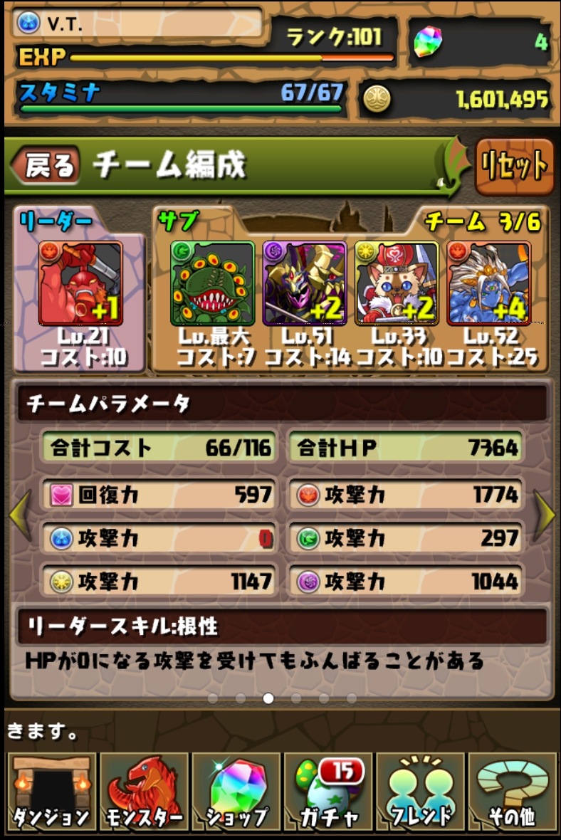 ポイントはリーダーの根性スキルと、フレンドの回復スキル。