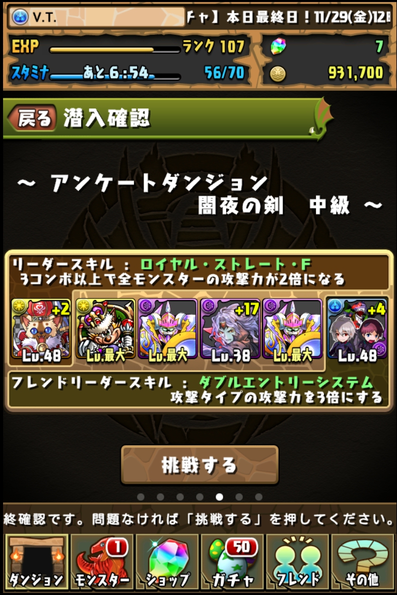 【パズドラ】アンケートダンジョン1 闇夜の剣 中級 パズドラ 公開日時:2013年12月9日 12:46 AM ページタイトルとURLをコピーする アンケートダンジョン 闇夜の剣 中級 攻略日記 本日(2013年12月9日)1日限定のアンケートダンジョン。 初級に続き、中級へ行ってみました。 パズドラ アンケートダンジョン 攻略記事リスト 敵は闇属性だけのようなので、光属性を入れてみました。 若干防御寄りのパーティーです。 道中です。 光属性の攻撃が威力を発揮し、サクサクと進みます! 被ダメージはこんな感じ。 BOSSはダークドラゴンナイトが2体。 光属性がいると楽ですね。 被ダメージは約2600。 同時攻撃を食らう前に片方を倒しておきましょう。 中級のコインと経験値。 パズドラ アンケートダンジョン 攻略記事リスト SQOOLのYouTubeチャンネル スポンサーリンク スポンサーリンク