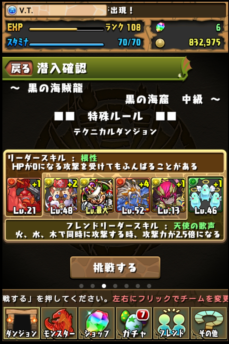 【パズドラ】黒の海賊龍 中級 攻略日記 パズドラ 公開日時:2013年12月30日 2:40 AM ページタイトルとURLをコピーする 黒の海賊龍 中級へ行ってみた! 黒の海賊龍が始まりました! 早速中級から行ってみましたのでご報告します。 パーティーです。 適当に組みました。 さて道中。 レッドパイレーツが出て来ますが 特段問題は無いと思います。 という訳で道中は省略! BOSSです。 黒の海賊龍・黒髭ティーチ 黒髭ですが髭は見えませんね。 被ダメージは369。 途中で闇から水に属性が変わります。 特別な攻撃はしてこないので、残りHPに気を付けつつ叩いていれば勝てると思います。 中級のコインと経験値はこんな感じ。 パズドラ 黒の海賊龍 上級 攻略日記 SQOOLのYouTubeチャンネル スポンサーリンク スポンサーリンク