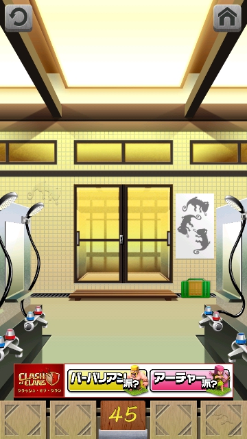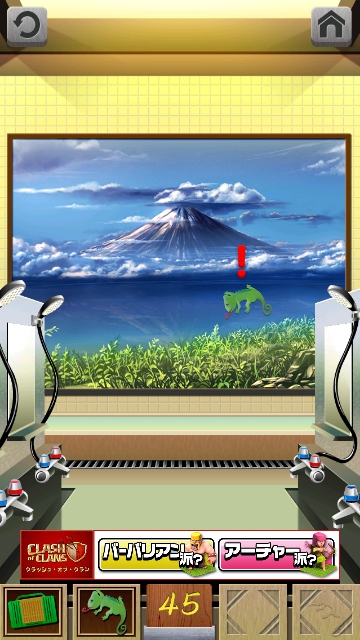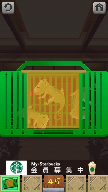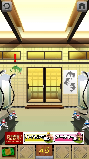 100銭湯 攻略 脱出法 ステージ41~45 |Page5 脱出ゲーム 更新日時:2015年7月23日 1:53 AM ページタイトルとURLをコピーする ステージ45 ドアの右に紙とカゴがあります。 カゴを手に入れます。 1 匹目のカメレオン発見。 スワイプして富士山の画面へ。 2 匹目のカメレオン発見。 下のアイコンのバーの右に 3 匹目のカメレオン発見。 カゴにカメレオン3 匹を入れると ドアが開きます。 100銭湯 攻略 脱出法 記事一覧 ページ: 1 2 3 4 5 前ページへ SQOOLのYouTubeチャンネル スポンサーリンク