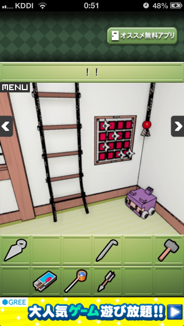 しゅりけんをロボに上げましょう。そうすると、しゅりけんを投げます。しゅりけんが刺さっている位置を覚えておきましょう。