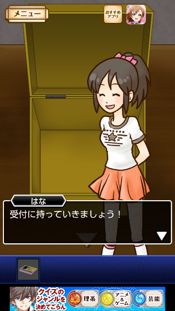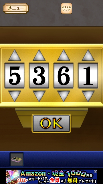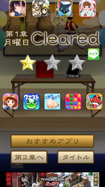謎解き名探偵ビリー 宿敵 攻略 月曜日|脱出ゲーム攻略 |Page3 脱出ゲーム 更新日時:2015年7月22日 12:16 PM ページタイトルとURLをコピーする 最後の黄の箱は 貼られた絵で共通しているのは星です。 左から星の数が 5 3 6 1 この数字を黄色の箱のパスワードに 入力してOKを押すと 開きます。中をタップすると はなが台帳にスタンプを押します。 3色揃ったので 受付に持っていくと 2位です。 ページ: 1 2 3 4 5 前ページへ 次ページへ SQOOLのYouTubeチャンネル スポンサーリンク