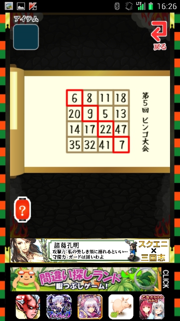ビンゴの赤枠「6」「9」「22」「7」の順に進みます。