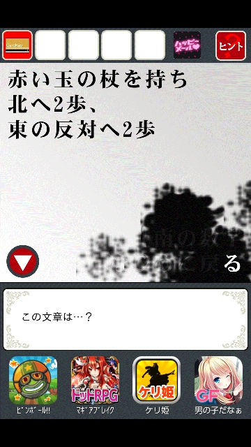 「赤い玉を持ち、北へ2歩 東の反対へ2歩」です。