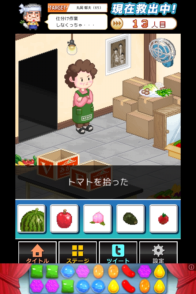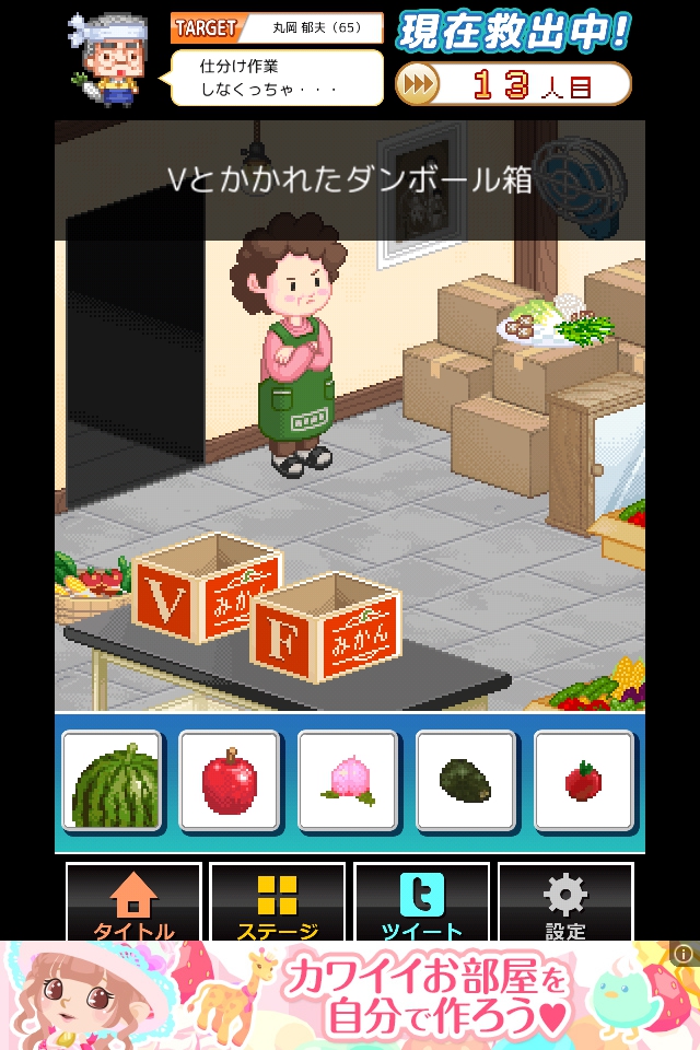 Vにスイカとトマト、Fにリンゴとモモとアボカドを入れ、奥さんをタップして脱出する。