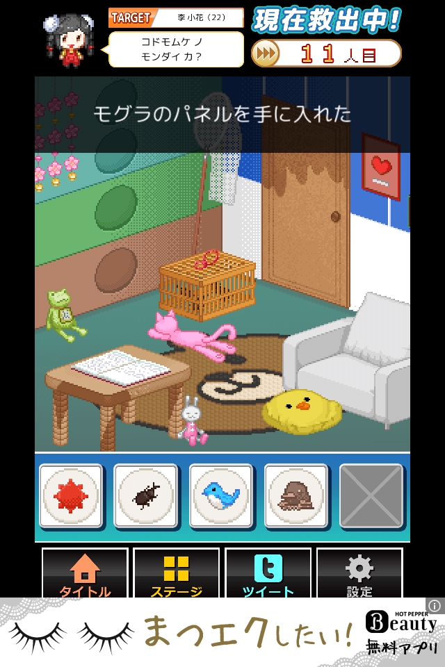 端末を左に傾けてクッションを床に落とし、モグラのパネルを入手する。