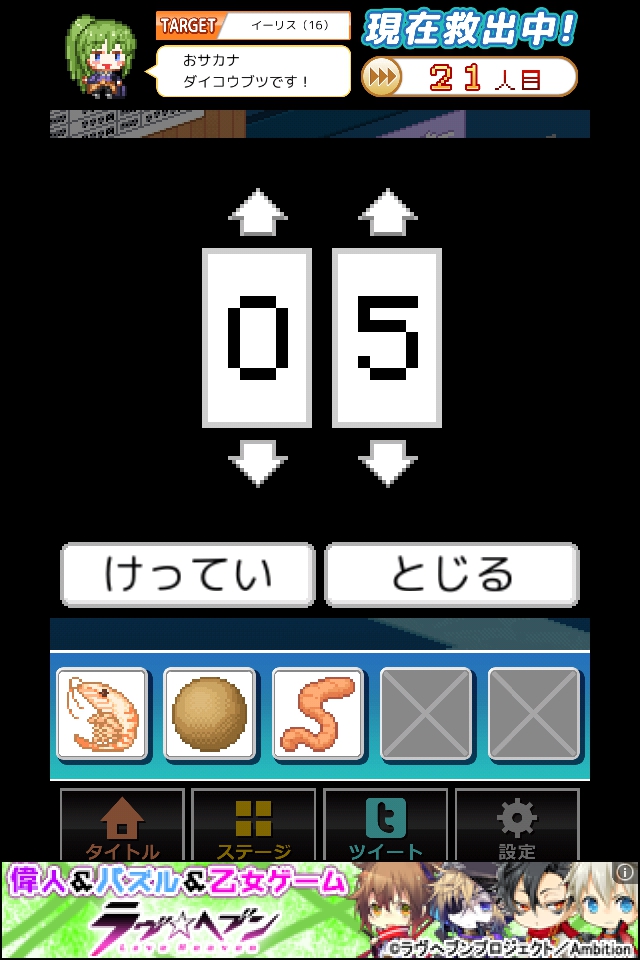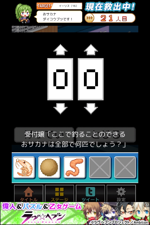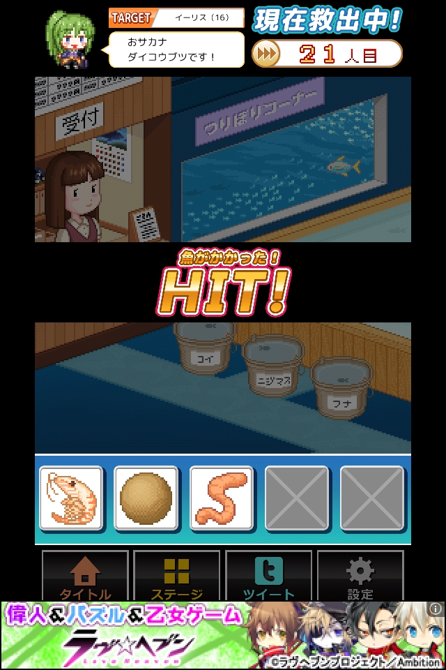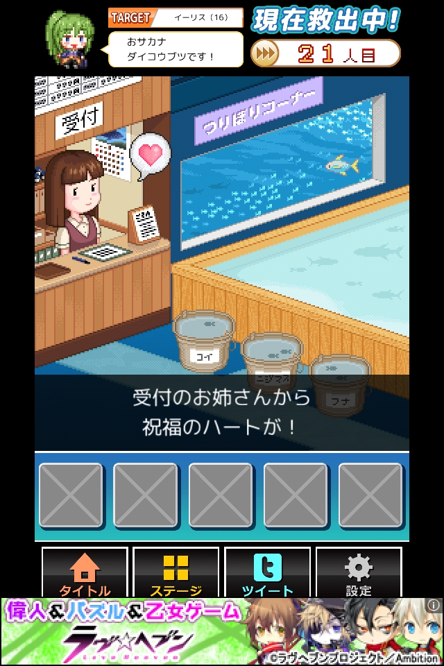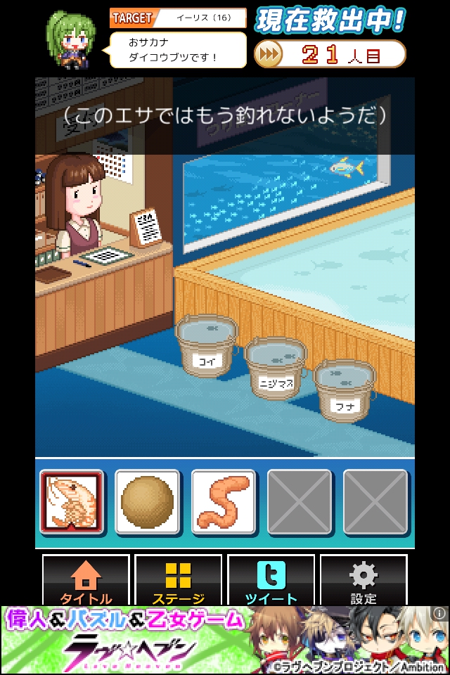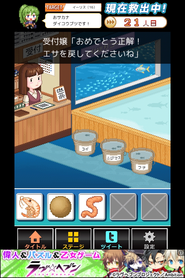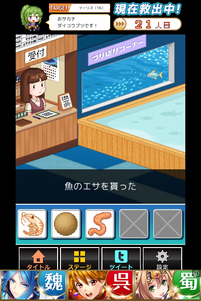 魚のエサをどれか1つタップして返却し、ハートをタップして脱出する。
