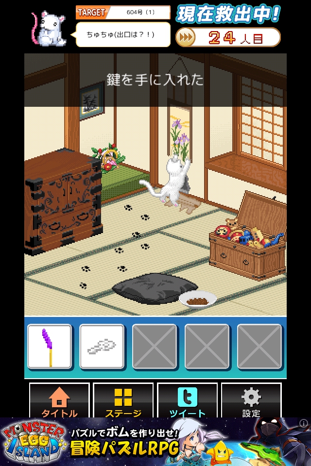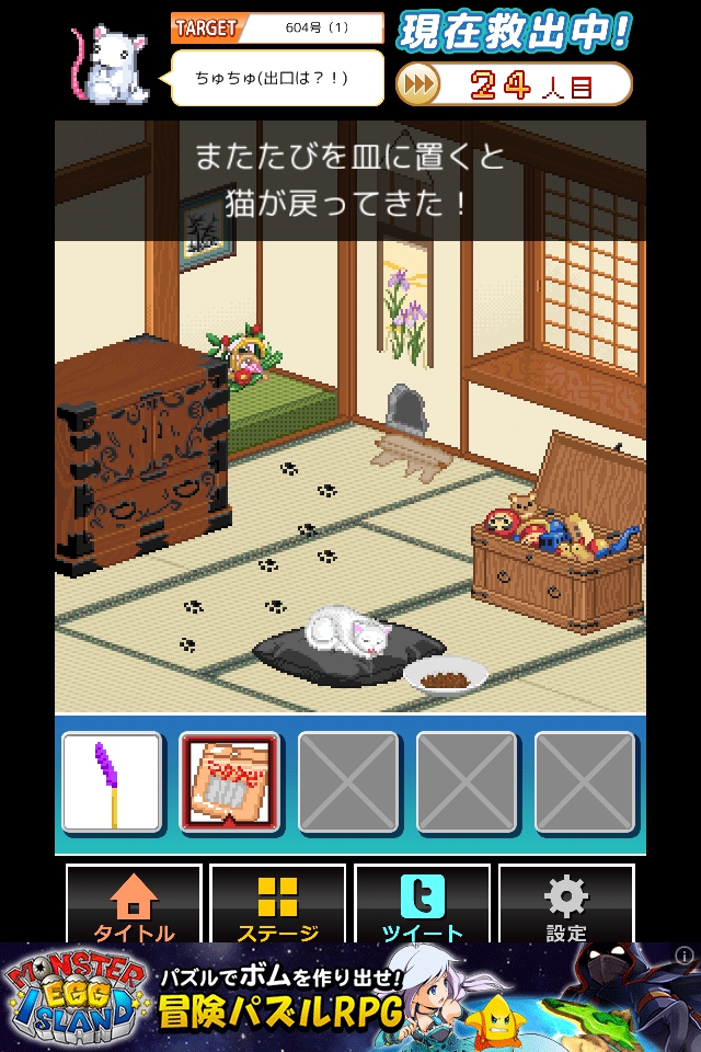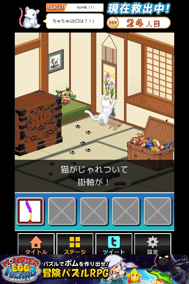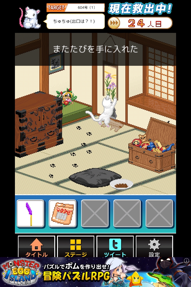 またたびを皿に置き、掛け軸の下にある穴をタップして脱出する。