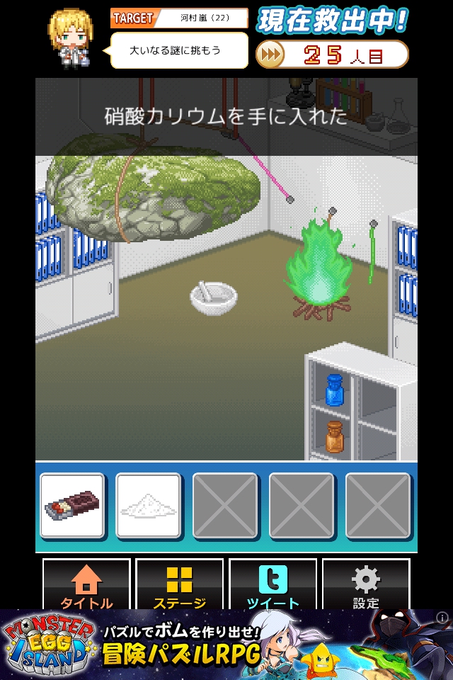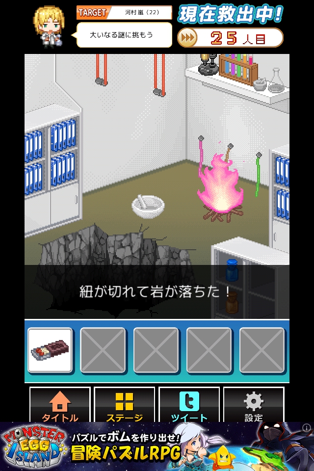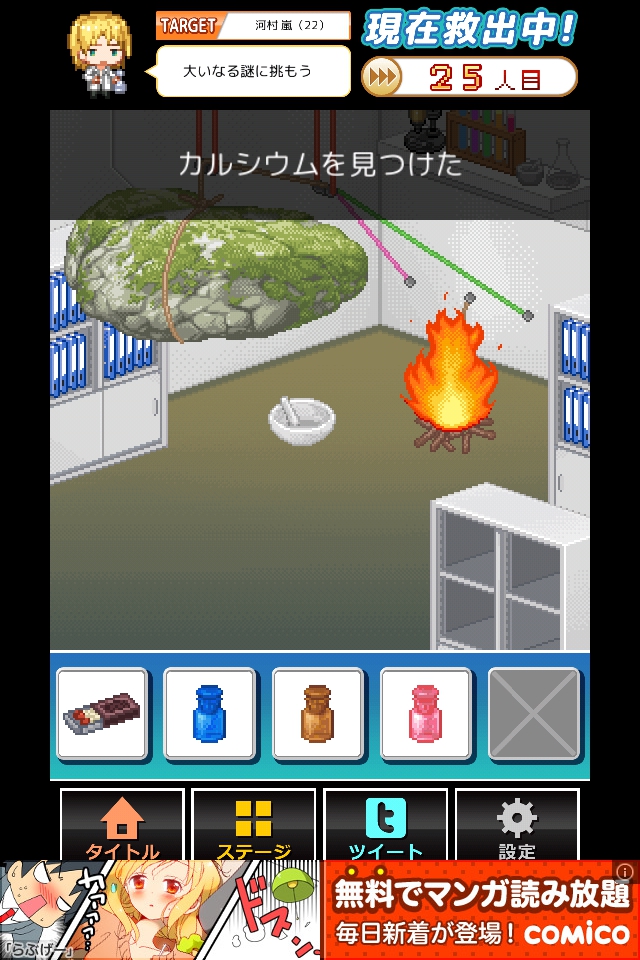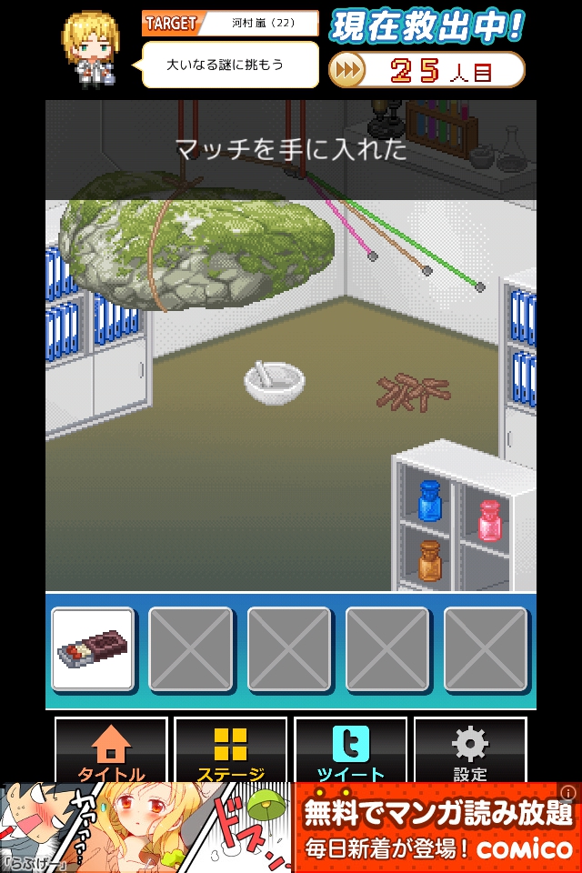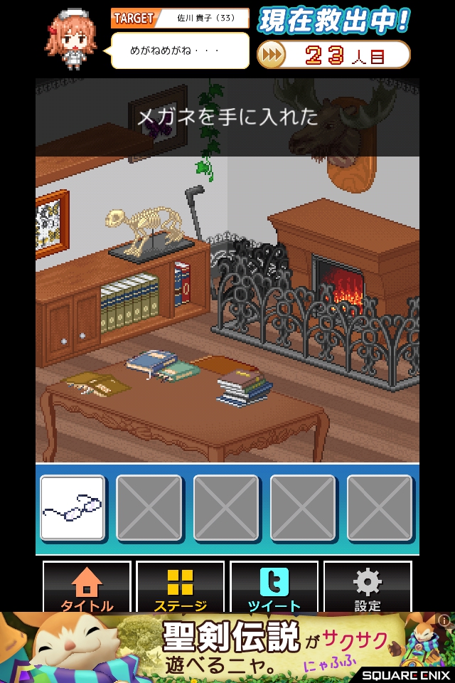 右下にあるメガネを入手し、左上のキャラクターをタップして脱出する。