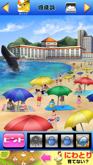 クジラにアミを使います。 魚が飛び出します。