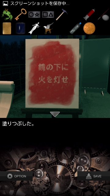 RECREATION(レクリエーション)攻略 その4|脱出ゲーム攻略 |Page2 脱出ゲーム 更新日時:2015年7月28日 11:19 AM ページタイトルとURLをコピーする ベランダに出て 正面のテーブルを調べます。 箱があるので開けると パスワードです。拡大して・・・ アイテムのパネルをはめます。 (カエルの像の裏と同じにします) ENTER を押すと カギが開いて・・・ 中から絵の具が現れるので 手に入れます。 ここで・・・ アイテムの筆と絵皿を出して 皿に絵の具を入れます。 そして 右のキャンバスを拡大して 絵の具の入った皿と筆を使います。 赤い絵の具の中に文字が現れます。 「鏡の下に火を灯せ」 部屋に 戻ります。 ページ: 1 2 3 前ページへ 次ページへ SQOOLのYouTubeチャンネル スポンサーリンク