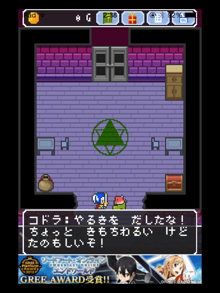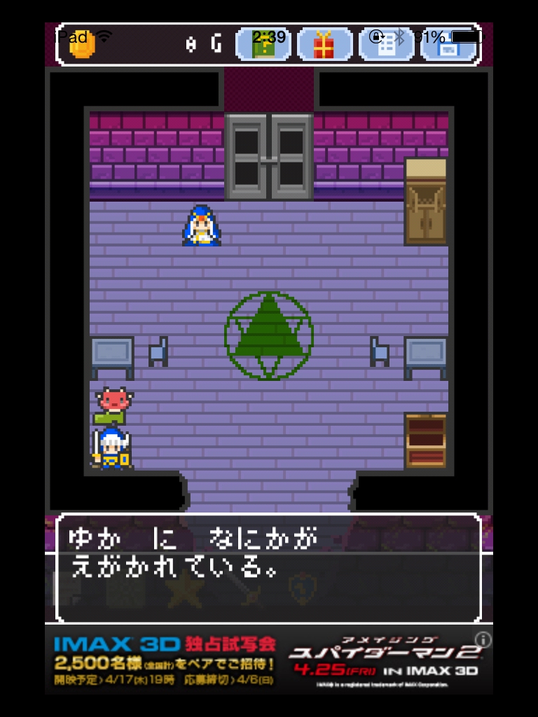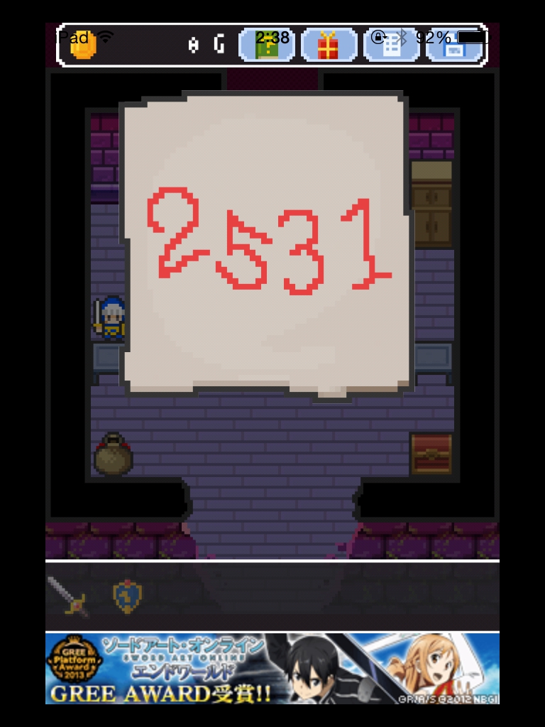 それでもやっぱりあいつ勇者やめるって 攻略記事その1|脱出ゲーム攻略 脱出ゲーム 更新日時:2015年7月23日 2:01 AM ページタイトルとURLをコピーする それでもやっぱりあいつ勇者やめるって 攻略記事その1 それでもやっぱりあいつ勇者やめるって 攻略記事一覧 勇者をやめたい勇者の冒険は続く! 今回も難しいです! さあ始まりです。 左の机から2531と書かれた紙を手に入れます。 右の机から石板が手に入ります。 タンスのパネルに2531と入力して開けます。 鍵が手に入ります。 鍵を使って宝箱を開けましょう。星が手に入ります。 魔方陣をなぞります。 ヒントばばあが出てきて壺を割ってくれます。 ページ: 1 2 次ページへ SQOOLのYouTubeチャンネル スポンサーリンク