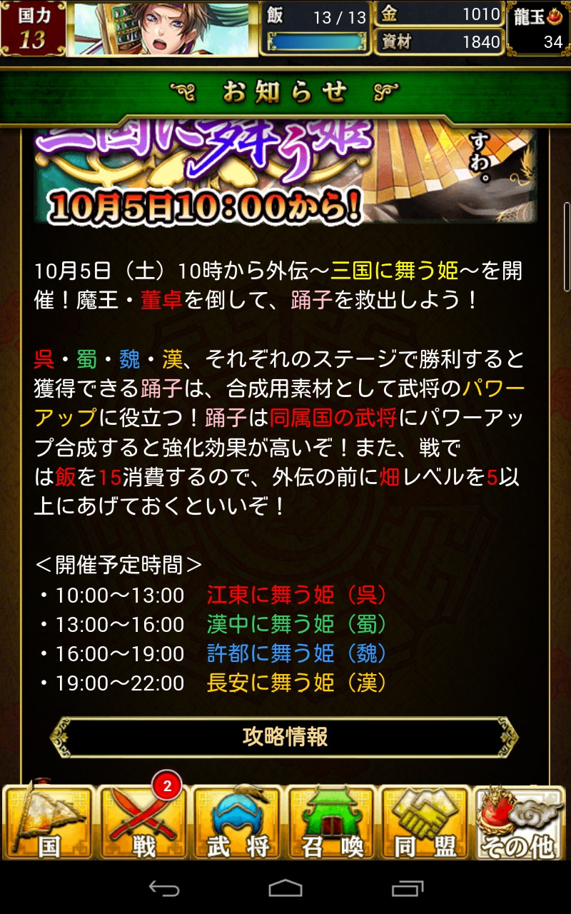 外伝「三国に舞う姫」は、魔王・董卓(とうたく)を倒して踊り子を救出するイベント。