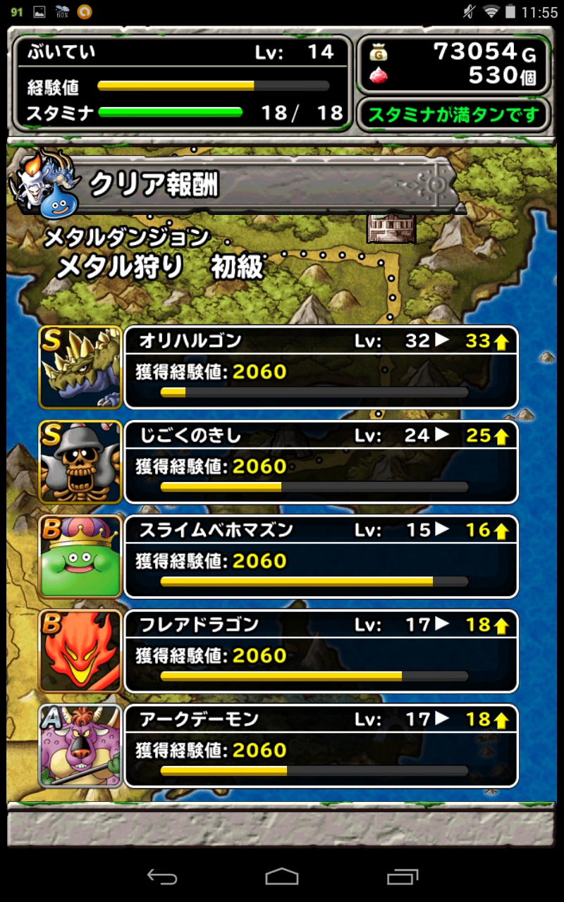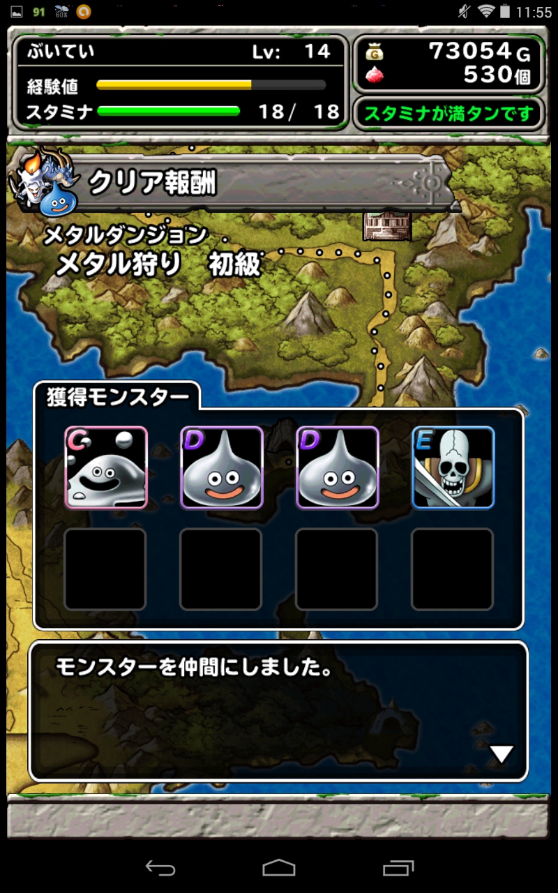 レベルの低い内は、メタルダンジョン初級1回でプレイヤーのレベルが上がってスタミナが全快します。