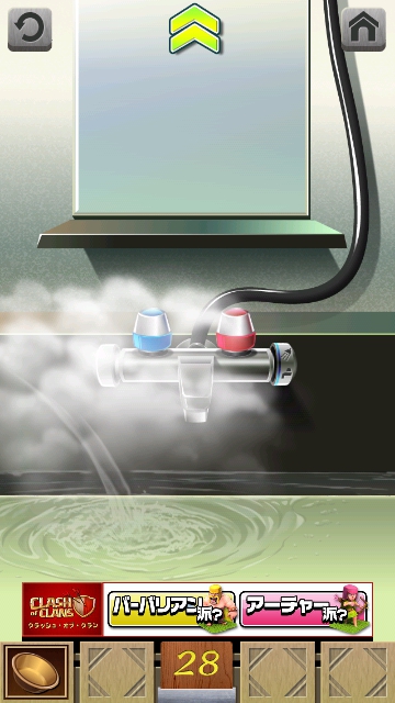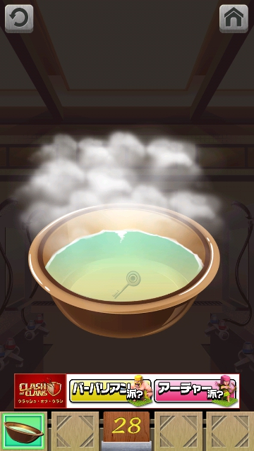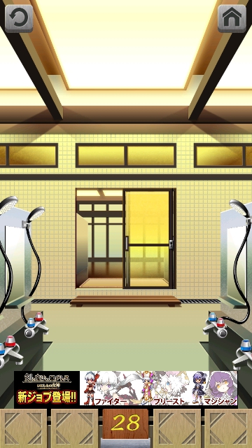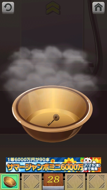 100銭湯 攻略 脱出法 ステージ26~30 |Page3 脱出ゲーム 更新日時:2015年7月23日 1:53 AM ページタイトルとURLをコピーする ステージ28 湯気のたつ洗面器があるので、取ります。 鍵がありますが、熱くて触れませんので お湯を捨てます。すると 鍵だけ残ります。しかし、まだ熱いので 洗面器に水を入れます。 これで鍵を取れます。 鍵を取って出口を開けましょう。 ページ: 1 2 3 4 5 前ページへ 次ページへ SQOOLのYouTubeチャンネル スポンサーリンク
