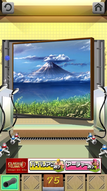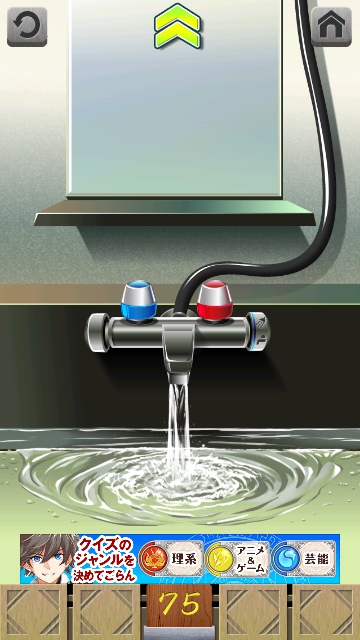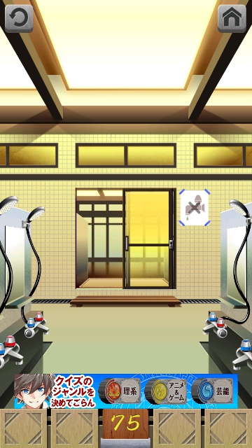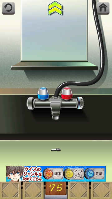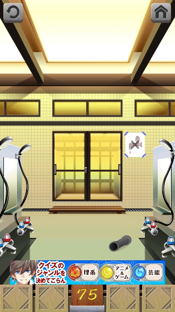 100銭湯 攻略 脱出法 ステージ71~75 |Page5 脱出ゲーム 更新日時:2015年7月23日 1:53 AM ページタイトルとURLをコピーする ステージ75 床にパイプがあるので、取ります。 スワイプして富士山の仮面へ。 富士山をタップすると 絵がずれて、 左の青のバルブの下から水が出ています。 ですので パイプを使って 修理します。 その後に どこの洗面台でもよいので、水を出します。 止めると、鍵が現れますので 鍵を使ってドアを開けましょう。 100銭湯 攻略 脱出法 記事一覧 ページ: 1 2 3 4 5 前ページへ SQOOLのYouTubeチャンネル スポンサーリンク