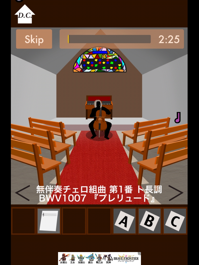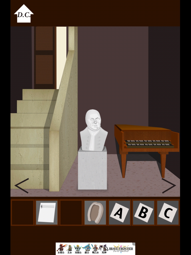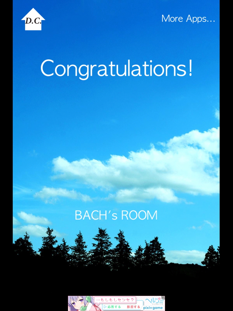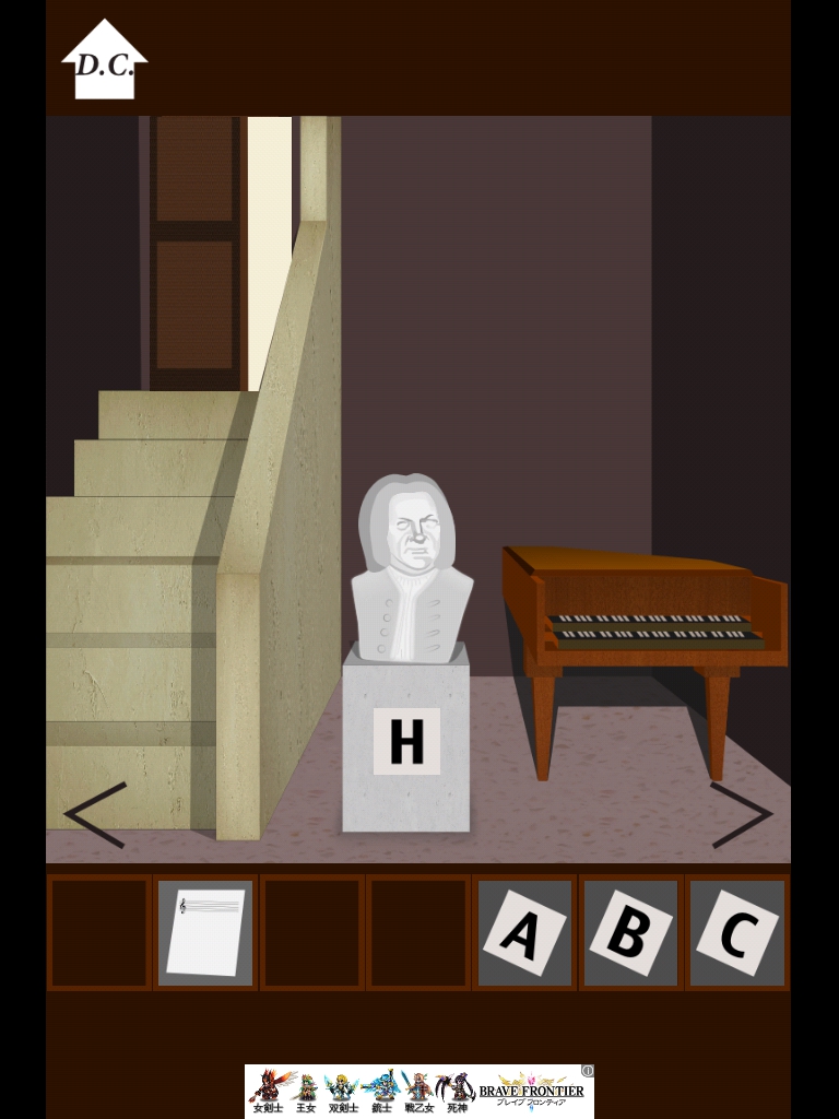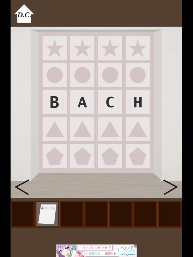 バッハの部屋 攻略|脱出ゲーム攻略 |Page3 脱出ゲーム 更新日時:2015年7月23日 1:53 AM ページタイトルとURLをコピーする 移動します。 床に落ちている本をタップ 「B」を回収。 バイオリンの弓を人物に渡します。 右へ移動。 音楽が始まります。 スキップしてもOK。 かつらを拾います。 この像にかつらをセット 「H」を回収。 このパネルに 「BACH」→「バッハ」 となるようにセット。 クリアです! ページ: 1 2 3 前ページへ SQOOLのYouTubeチャンネル スポンサーリンク