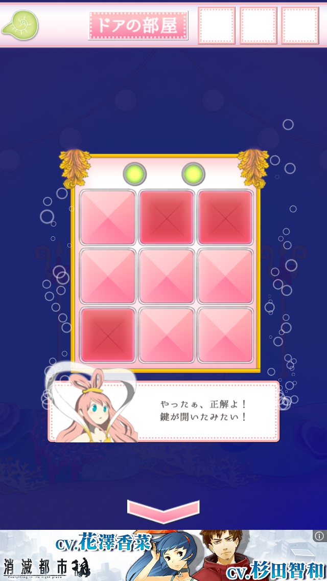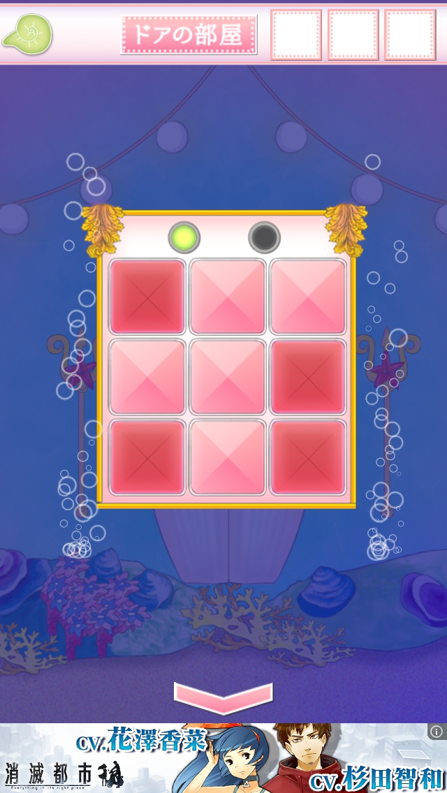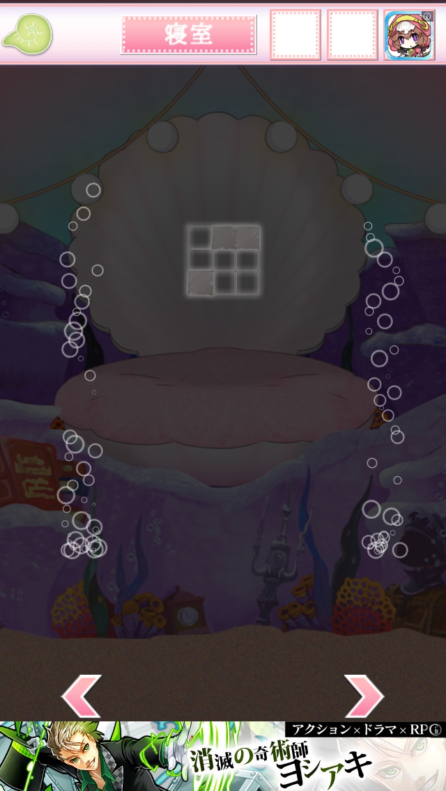リュウグウ城からの脱出 ステージ16~20 攻略 |Page3 脱出ゲーム 更新日時:2015年7月22日 12:16 PM ページタイトルとURLをコピーする ステージ18 貝に描かれたマス目の黒の部分を覚えて ドアの部屋へ。 ドアの装置を拡大して、黒のマス目に あたるところをタップします。 海の広間に移動します。左の岩の上の ボタンを押すと電気が消えて暗くなります。 寝室へ移動します。 マス目が変わっています。白の部分を覚えて ドアの部屋へ。 ドアの装置を拡大して、白の部分にあたる ところを赤にします。 ドアをタップして脱出しましょう。 ページ: 1 2 3 4 5 前ページへ 次ページへ SQOOLのYouTubeチャンネル スポンサーリンク