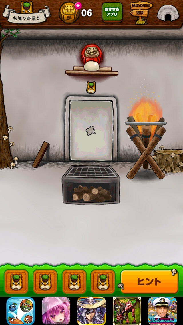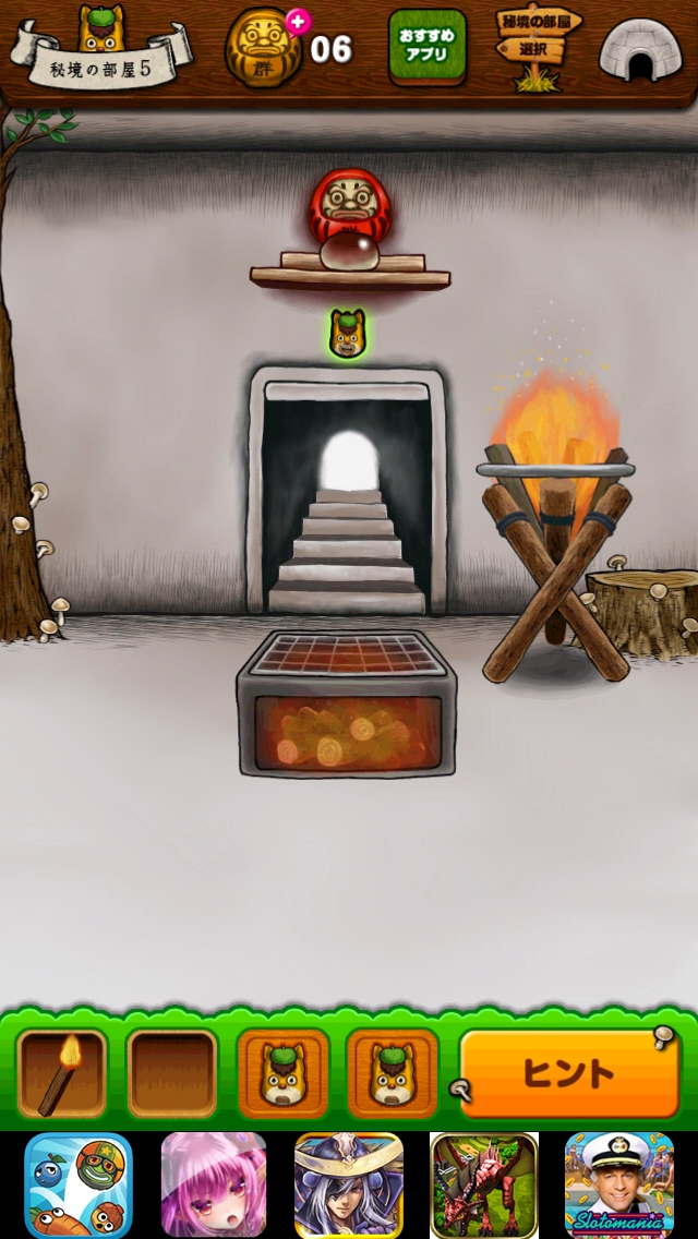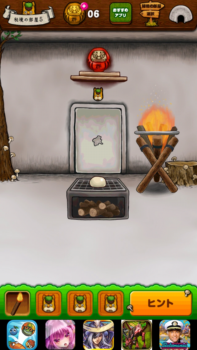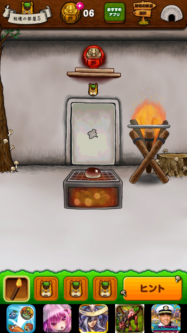 秘境 グンマーからの脱出 本編 ステージ1~5 |Page5 脱出ゲーム 更新日時:2015年7月23日 1:53 AM ページタイトルとURLをコピーする ステージ5 扉の上の神棚にあるまんじゅうを取って 網の上に乗せます。 扉の左にある木の棒を取り、松明から火を つけます。 火のついた木の棒でまんじゅうの下に火を つけます。焼きまんじゅうが出来ます。 焼きまんじゅうを神棚へ置きます。 ぐんまちゃんが光るので扉から出ましょう。 秘境 グンマーからの脱出 攻略記事一覧 ページ: 1 2 3 4 5 前ページへ SQOOLのYouTubeチャンネル スポンサーリンク