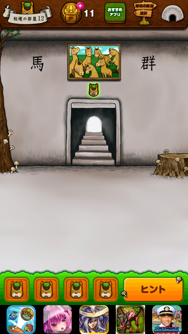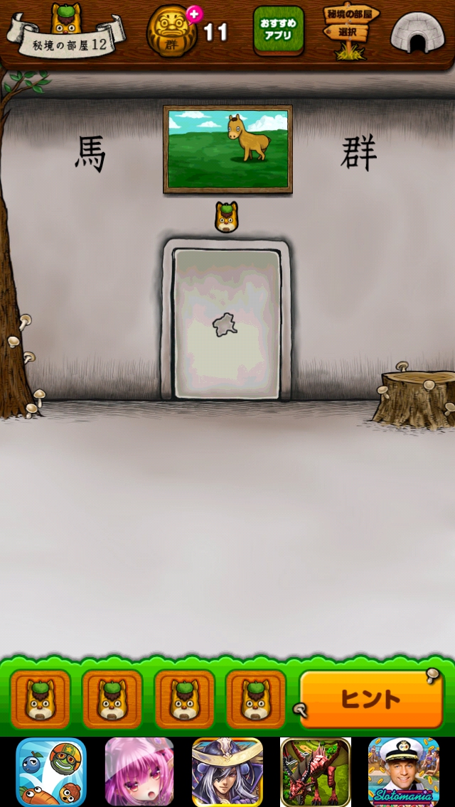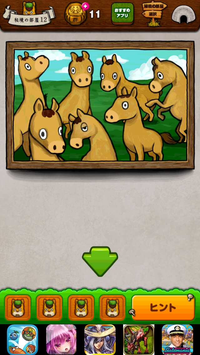 秘境 グンマーからの脱出 本編 ステージ11~15 |Page2 脱出ゲーム 更新日時:2015年7月23日 1:53 AM ページタイトルとURLをコピーする ステージ12 扉の上の絵をタップします。 下の矢印で元に戻ってまた絵をタップすると 馬が1頭増えます。馬が7頭になるまで 繰り返します。 扉から出ましょう。 ページ: 1 2 3 4 5 前ページへ 次ページへ SQOOLのYouTubeチャンネル スポンサーリンク