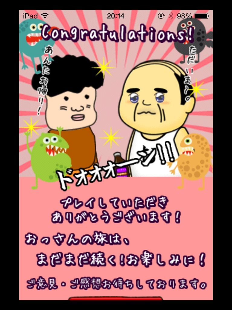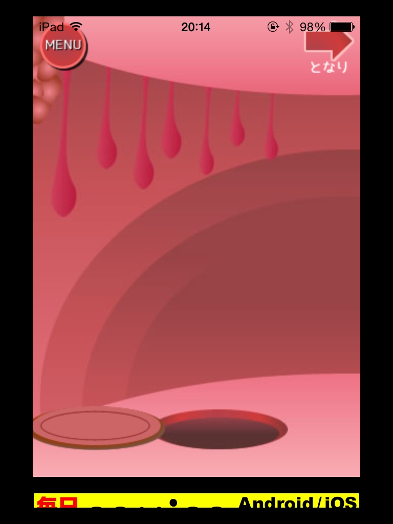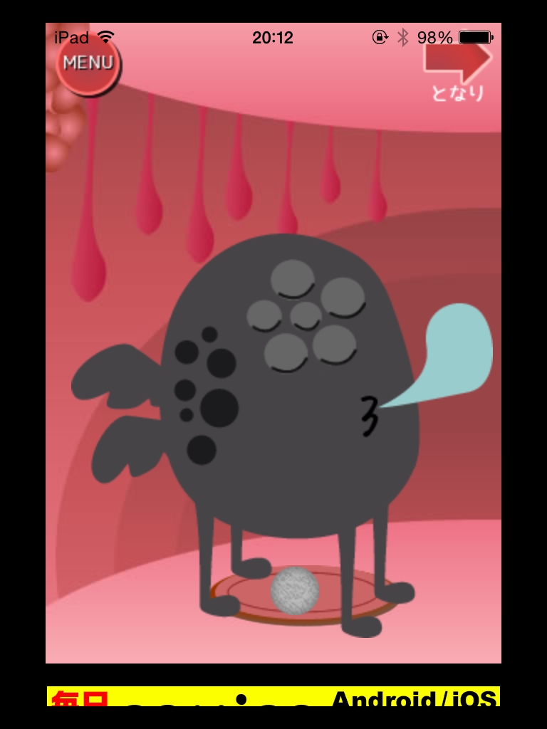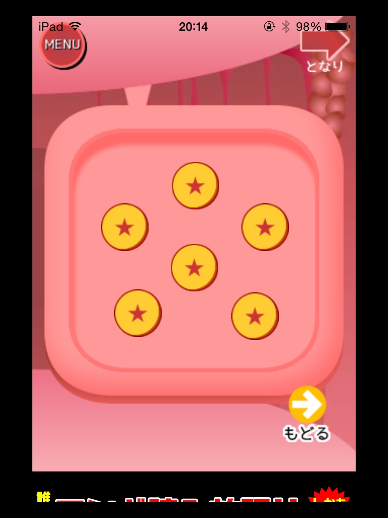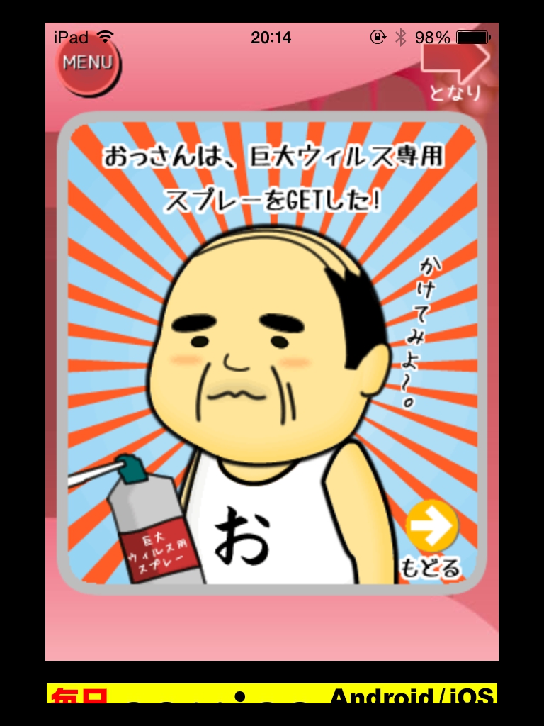 体内からの脱出ゲーム(おっさんシリーズ) 攻略 STAGE21・22 |Page2 脱出ゲーム 更新日時:2015年7月23日 2:01 AM ページタイトルとURLをコピーする STAGE22 部屋を移動します。 ウイルスの目が閉じる順番を覚えます。 眼を全部閉じて寝ているときに足元の石を取ります。 石を最初の部屋のパネルにはめます。 ウイルスが目を閉じた順番に丸をタップしていきます。 左下→中央→上→左上→右上→右下 の順ですね。 巨大ウイルス専用スプレーが手に入ります。 スプレーでウイルスを退治して脱出します。 脱出完了!! やったぜおっさん!! 体内からの脱出ゲーム(おっさんシリーズ) 攻略記事一覧 ページ: 1 2 前ページへ SQOOLのYouTubeチャンネル スポンサーリンク