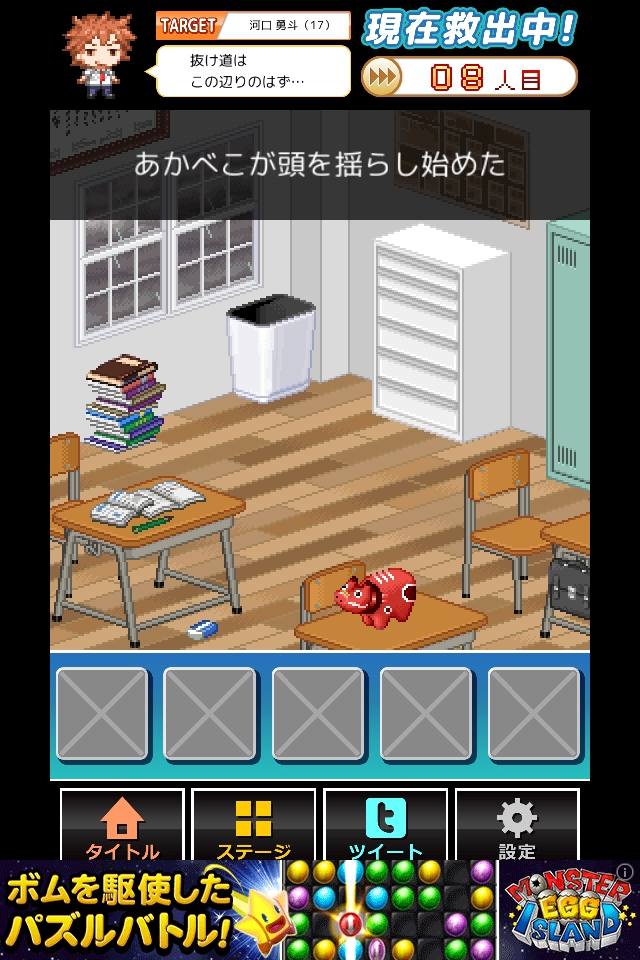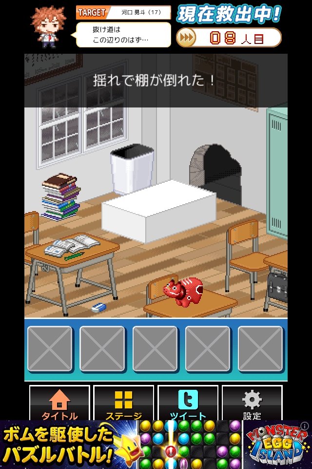 端末を揺らすと棚が倒れるので、脱出する。
