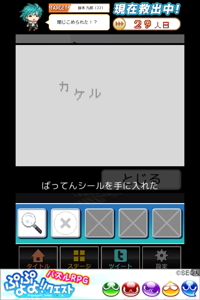 虫眼鏡で壁に書かれた小さい字を読み、ばってんシールを入手する。