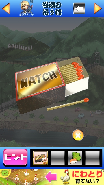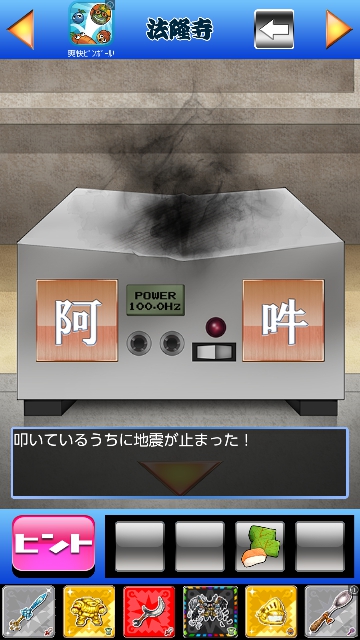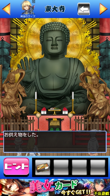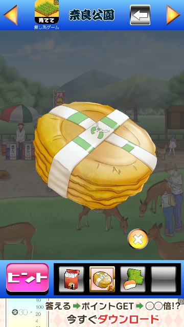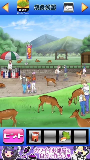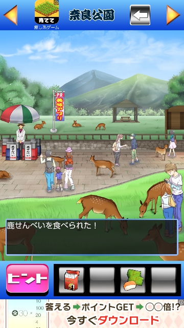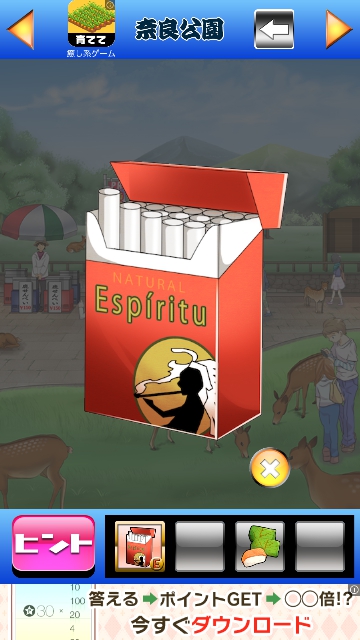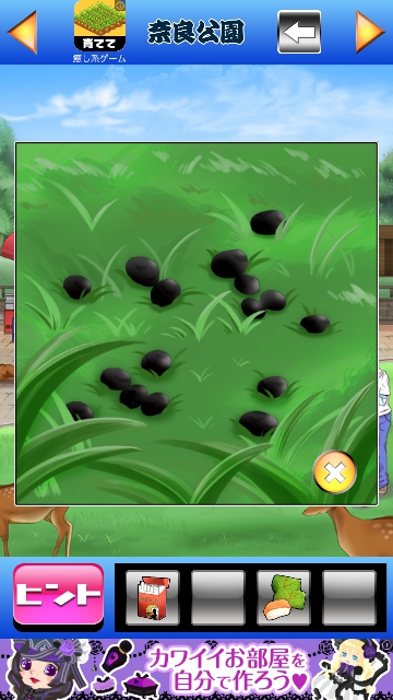 GTG48 関西編 奈良県 攻略|脱出ゲーム攻略 |Page2 脱出ゲーム 更新日時:2015年7月23日 1:53 AM ページタイトルとURLをコピーする スピーカーは何度も叩いて壊します。 2人の観光客の〇部分を調べます。 タバコを手に入れます。 鹿せんべい屋でせんべいを買います。 せんべいを手前中央の鹿に食べさせます。 しばらくすると鹿がフンをします。調べます。 左下あたりを調べると・・・ 2個目の黒いカケラです。 吊り橋の下の人にタバコを渡します。 代わりにマッチをくれます。 橋の奥には注意書きがあります。 大仏にお寿司をお供えします。 ページ: 1 2 3 前ページへ 次ページへ SQOOLのYouTubeチャンネル スポンサーリンク