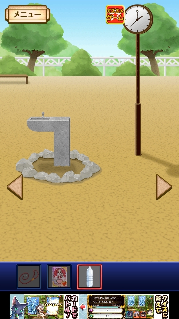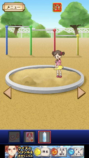 「水の入ったペットボトル」を使って、砂場の女の子をタップします。