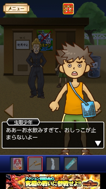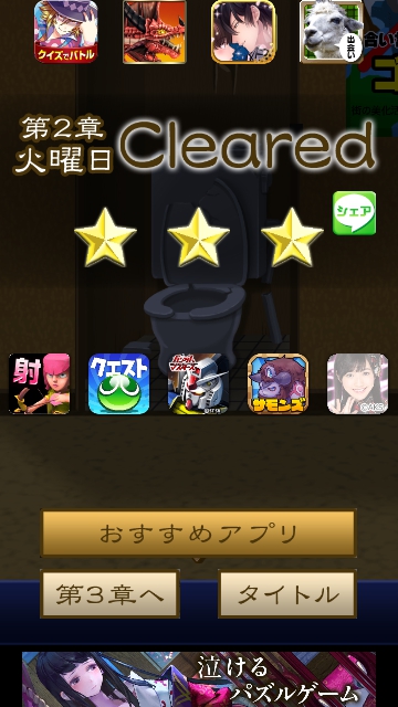 謎解き名探偵ビリー 火曜日★~★★★全攻略|脱出ゲーム攻略 |Page8 脱出ゲーム 更新日時:2017年11月12日 4:26 PM ページタイトルとURLをコピーする 【火曜日★★★の攻略】 火曜日限定でプレイします。 (参考ですが、携帯電話の日時を変更させて火曜日に変えてプレイでもよいようです。) 同じ手順でプレイするとトイレの前にヒロシと「虫取少年」がいます。 「虫取少年」をタップします。 この先も同じ手順で最後まで進んでください。 火曜日の★★★をクリアです。 謎解き脱出ゲーム 名探偵ビリー 各曜日完全攻略 ページ: 1 2 3 4 5 6 7 8 前ページへ SQOOLのYouTubeチャンネル スポンサーリンク