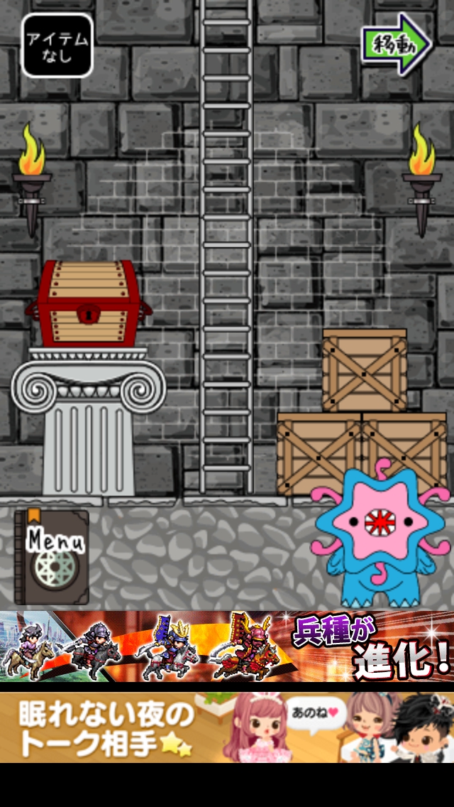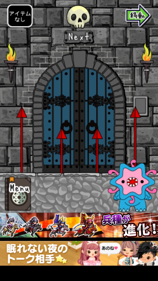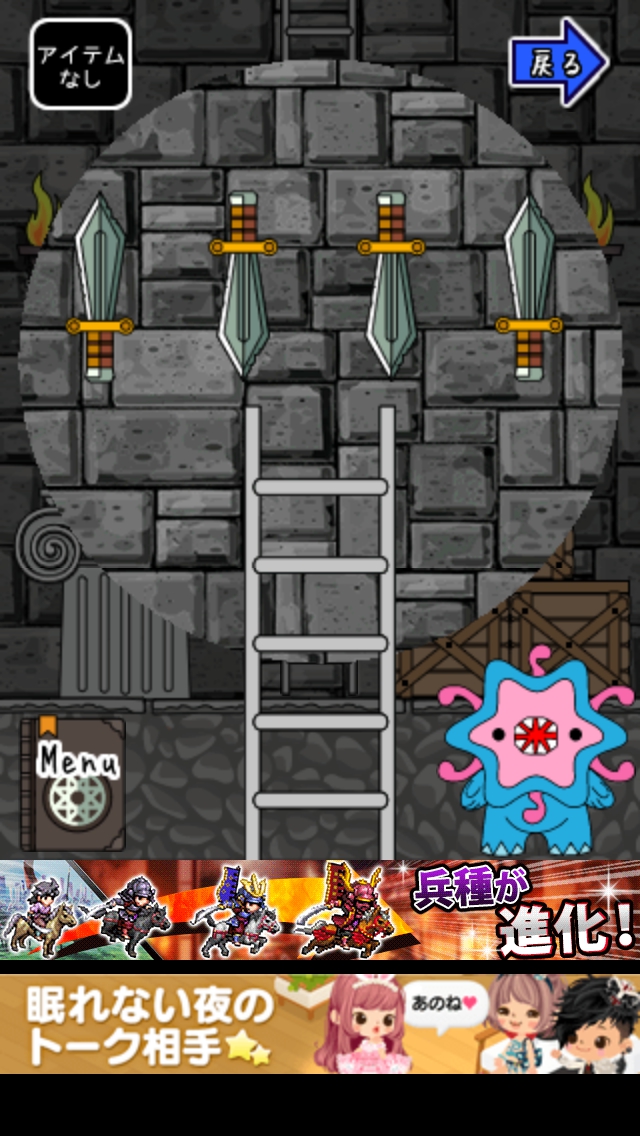 モンスターVS勇者 攻略 ステージ11~15|脱出ゲーム攻略 |Page2 脱出ゲーム 更新日時:2015年7月22日 12:16 PM ページタイトルとURLをコピーする ステージ12 真ん中のハシゴを登ります。 4本の剣のうち中2本が下向きです。 扉の前に行くと4本の赤い槍があります。 中2本をタップして下げると槍が消えます。 扉をタップして脱出しましょう。 ページ: 1 2 3 4 5 前ページへ 次ページへ SQOOLのYouTubeチャンネル スポンサーリンク