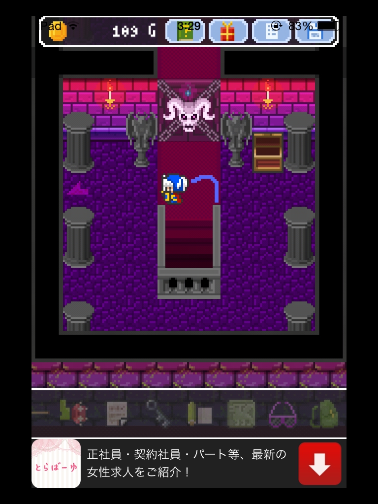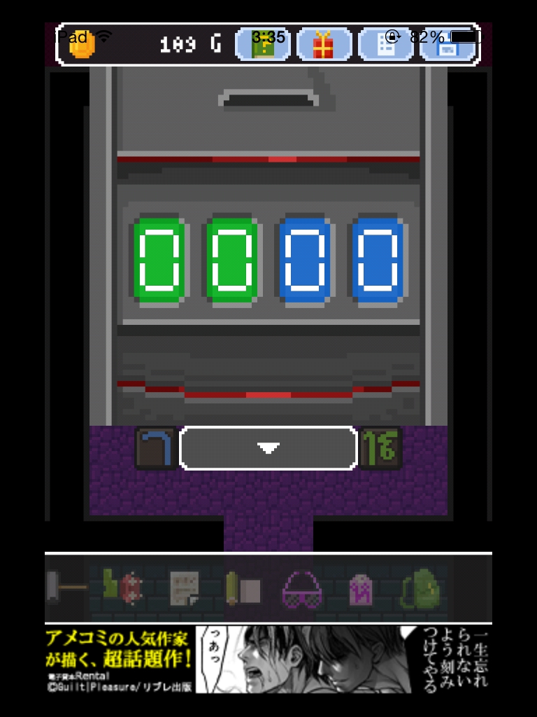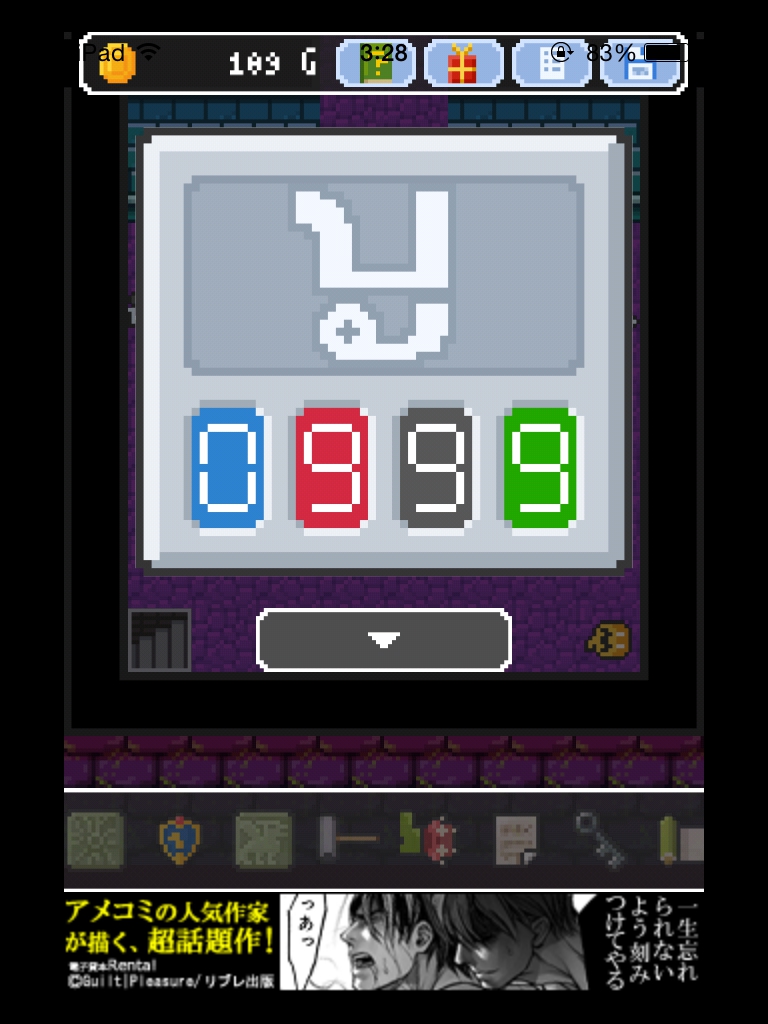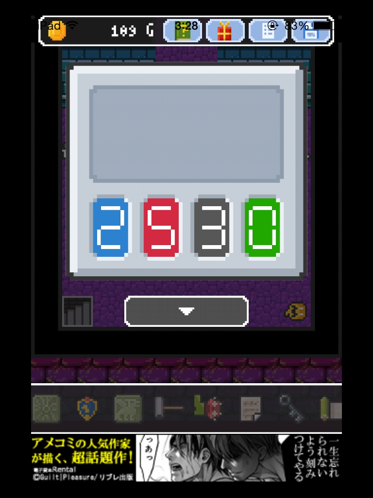 それでもやっぱりあいつ勇者やめるって 攻略記事その4|脱出ゲーム攻略 |Page2 脱出ゲーム 更新日時:2015年7月23日 2:01 AM ページタイトルとURLをコピーする 階段を上がってすぐの部屋のパネルを見ます。 これに、像が持っている球の数を入力します。 青2 赤5 黒3 緑4 紋章が浮かび上がりました。 左奥の部屋のレバーを一度戻します。 真ん中の部屋の壁に石板があるので、パズルを合わせてゲットします。 階段を上ってサングラスを掛けます。 紋章と矢印が見えます。 柱の中から人が出てきてお守りをくれます。 左奥の部屋のレバーを戻して、 石板が4つ並んでいる部屋に入ります。 今まで見た紋章の色と形に合わせます。 装置が出てきて入力パネルがあります。 左の部屋でサングラスを書けると床に緑で 83 と書かれています。 右の部屋に行って サングラスで見ると青い字で 96 と書かれています。 石板の部屋の装置に 8396 と入力すると 箱が手に入ります。 ページ: 1 2 3 前ページへ 次ページへ SQOOLのYouTubeチャンネル スポンサーリンク