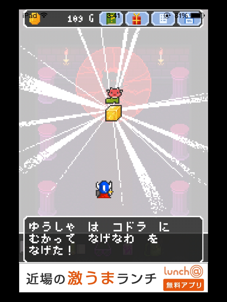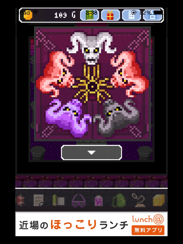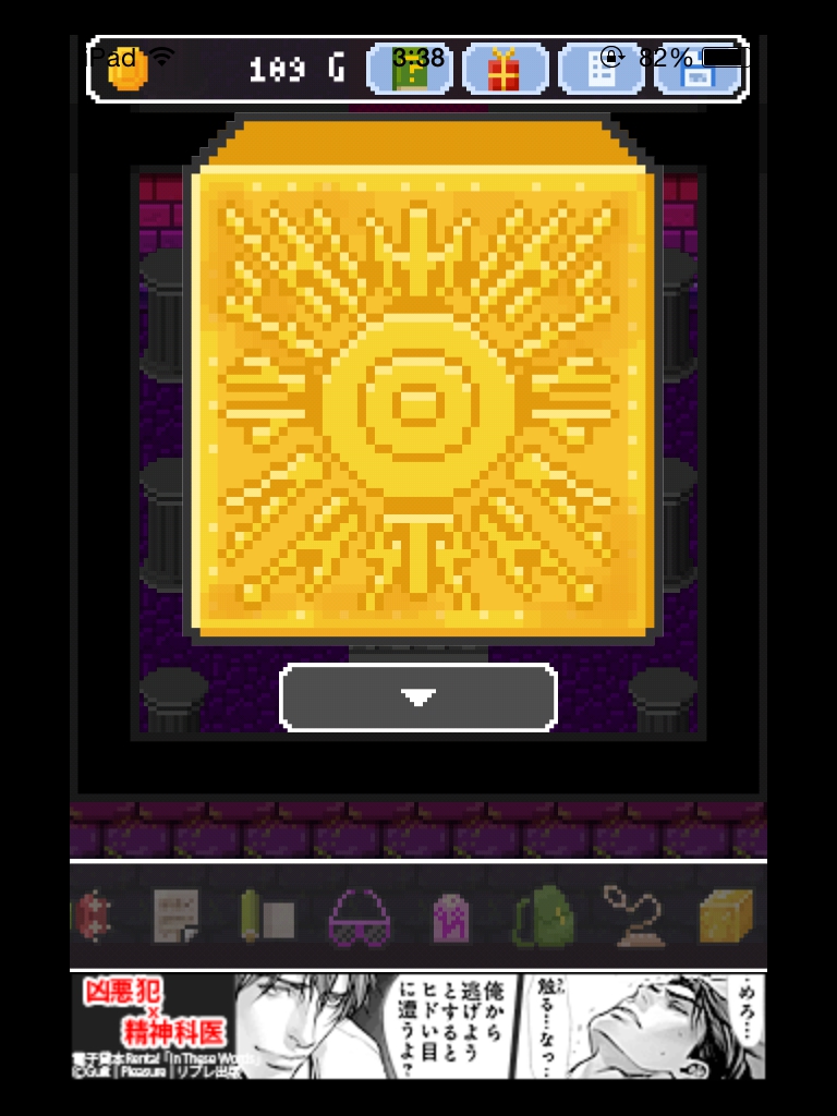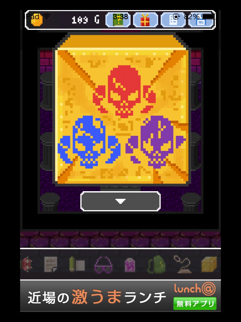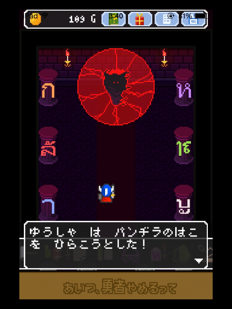 それでもやっぱりあいつ勇者やめるって 攻略記事その4|脱出ゲーム攻略 |Page3 脱出ゲーム 更新日時:2015年7月23日 2:01 AM ページタイトルとURLをコピーする 箱の上と下をタップすると絵が描かれています。 魔王の部屋の右の宝箱は2つアイテムが入っているので必ず取りましょう。 金色の箱に書かれていた絵をヒントに扉の紋章の色を合わせます。 金色の箱の絵を見ると 白→4本 赤→2本 青→1本 紫→3本 の亀裂が入っています。 その本数と、魔王の部屋の扉の中央から伸びている線の数を合わせます。 白 赤 赤 紫 紫 ですね。 いよいよ魔王が出て来ます。 まずサングラスを使います。 次に金色の箱。 紋章を順番通りにタップするゲームです。 コドラは投げ縄で救いましょう。 さて、無事に勇者をやめられたんでしょうか・・・? END それでもやっぱりあいつ勇者やめるって 攻略記事一覧 ページ: 1 2 3 前ページへ SQOOLのYouTubeチャンネル スポンサーリンク