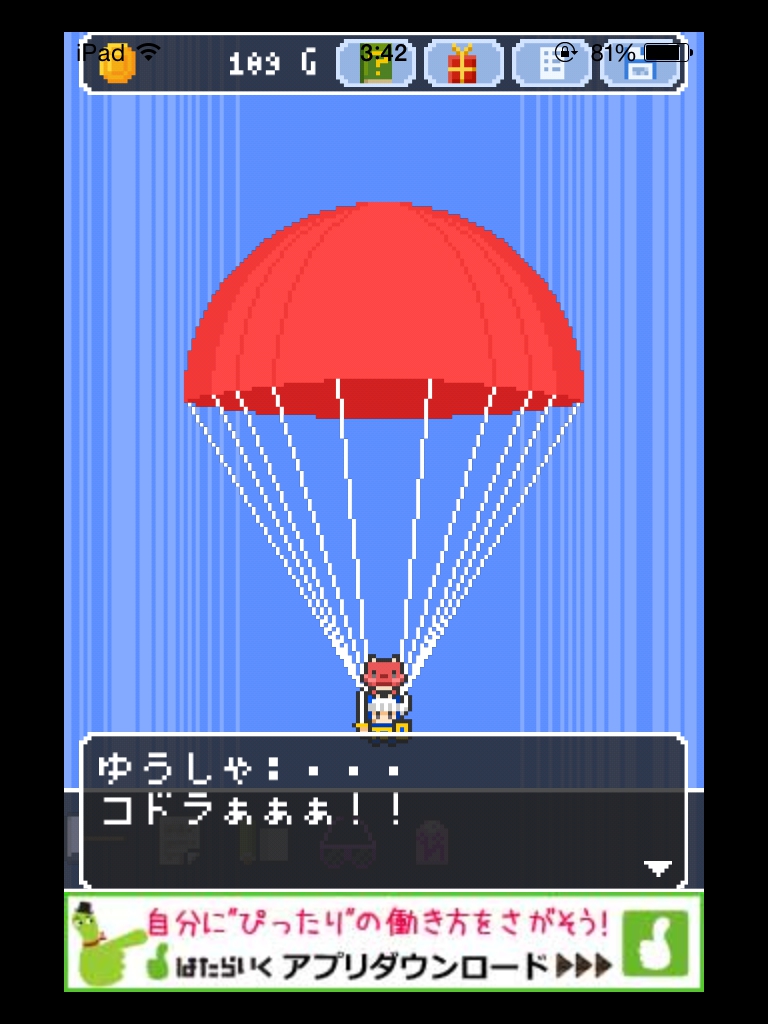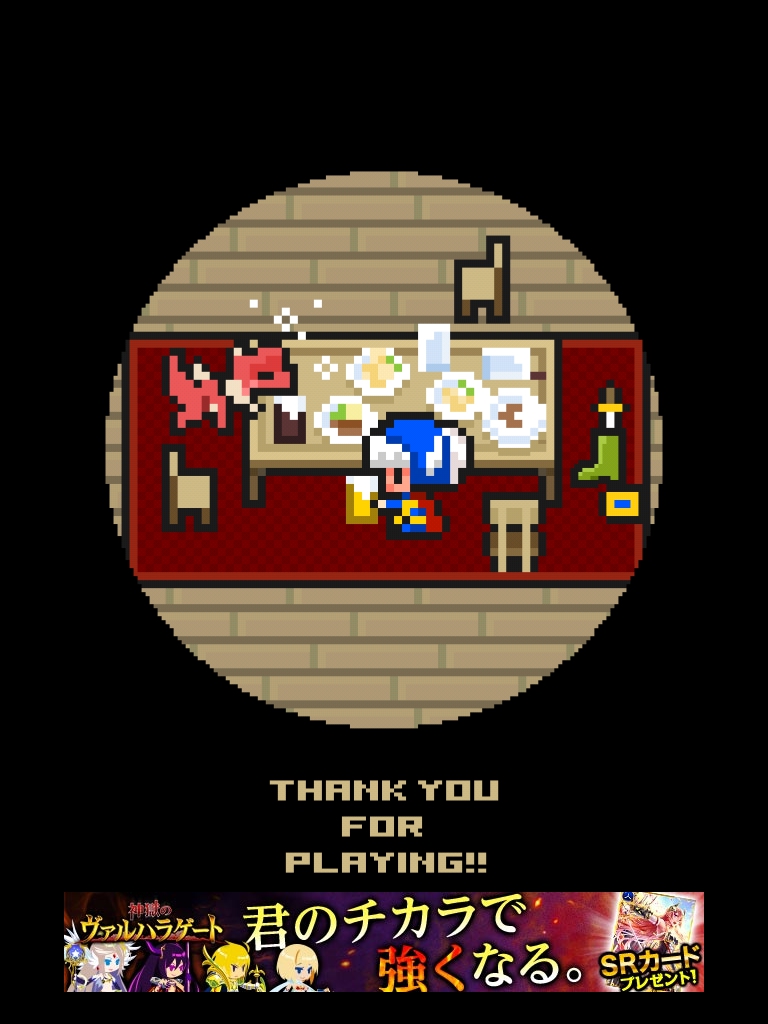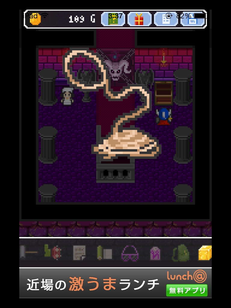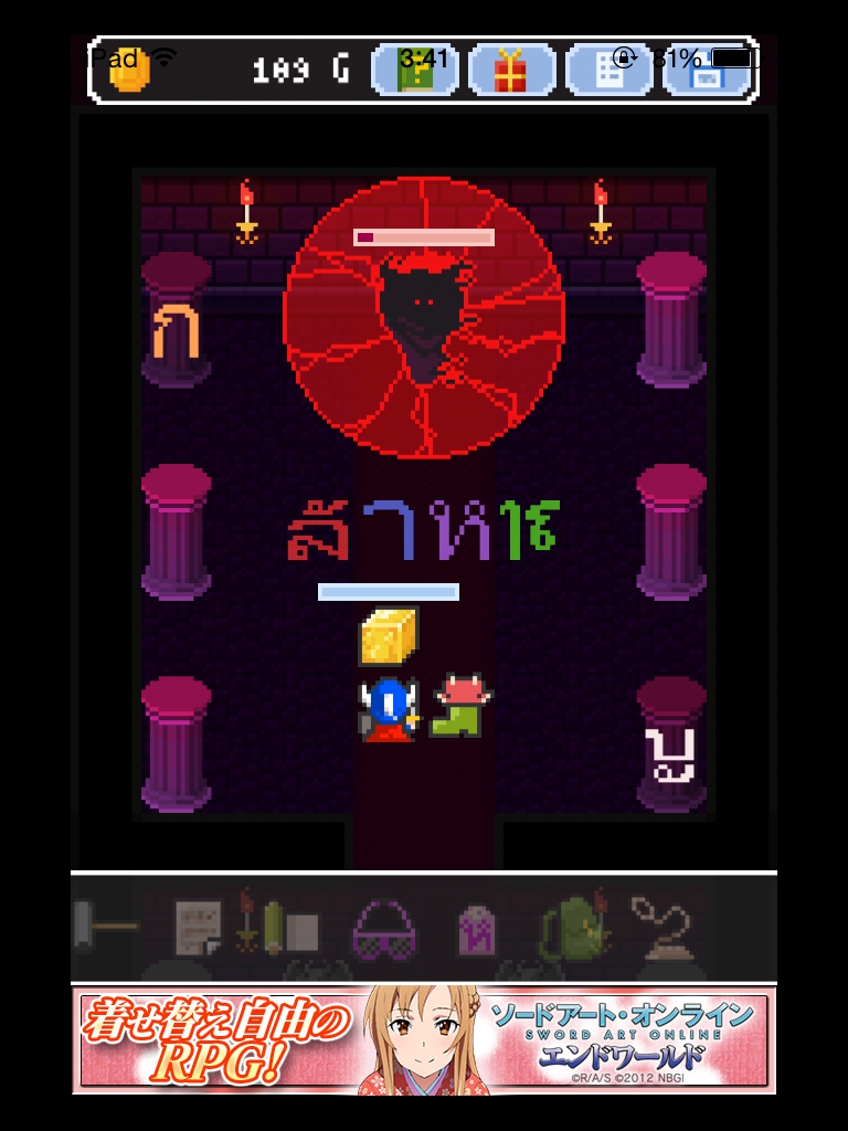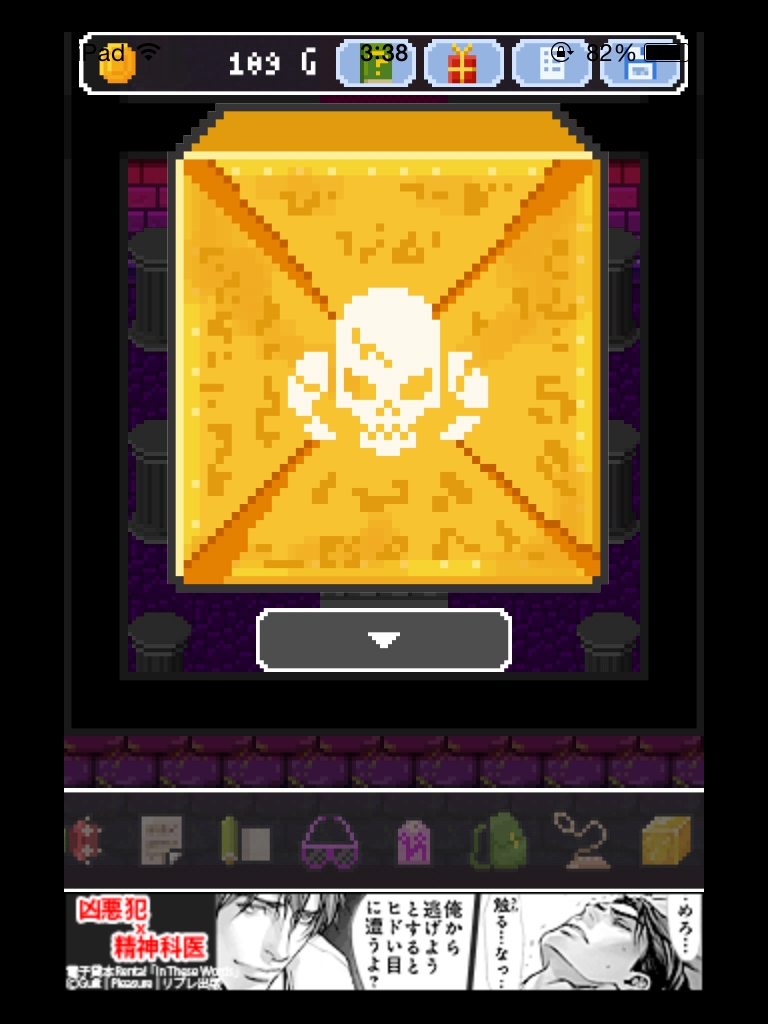 それでもやっぱりあいつ勇者やめるって 攻略記事その4|脱出ゲーム攻略 |Page3 脱出ゲーム 更新日時:2015年7月23日 2:01 AM ページタイトルとURLをコピーする 箱の上と下をタップすると絵が描かれています。 魔王の部屋の右の宝箱は2つアイテムが入っているので必ず取りましょう。 金色の箱に書かれていた絵をヒントに扉の紋章の色を合わせます。 金色の箱の絵を見ると 白→4本 赤→2本 青→1本 紫→3本 の亀裂が入っています。 その本数と、魔王の部屋の扉の中央から伸びている線の数を合わせます。 白 赤 赤 紫 紫 ですね。 いよいよ魔王が出て来ます。 まずサングラスを使います。 次に金色の箱。 紋章を順番通りにタップするゲームです。 コドラは投げ縄で救いましょう。 さて、無事に勇者をやめられたんでしょうか・・・? END それでもやっぱりあいつ勇者やめるって 攻略記事一覧 ページ: 1 2 3 前ページへ SQOOLのYouTubeチャンネル スポンサーリンク