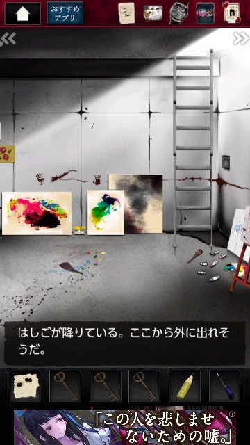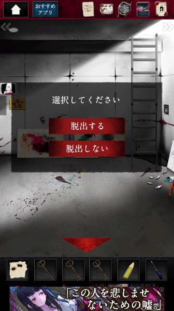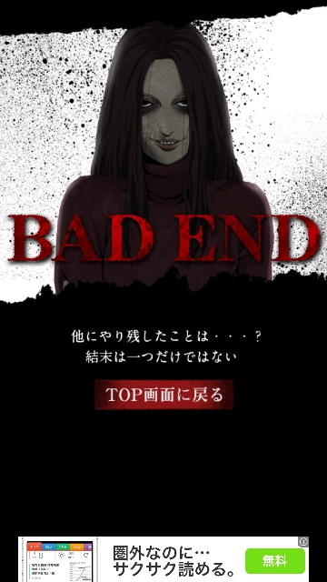 ストーカー女からの脱出 攻略 バッドエンド 3パターン |Page2 脱出ゲーム 更新日時:2015年7月23日 1:53 AM ページタイトルとURLをコピーする パターン2 上のアイテムが6 種類そろってない場合。 (ここではベッドの下の青い日記がありません。) その状態でハシゴから脱出すると・・・ ページ: 1 2 3 前ページへ 次ページへ SQOOLのYouTubeチャンネル スポンサーリンク