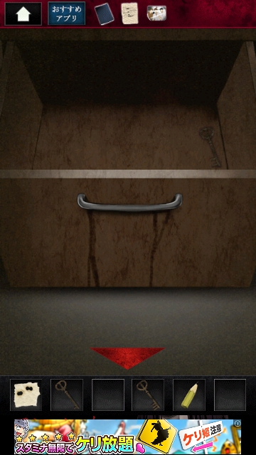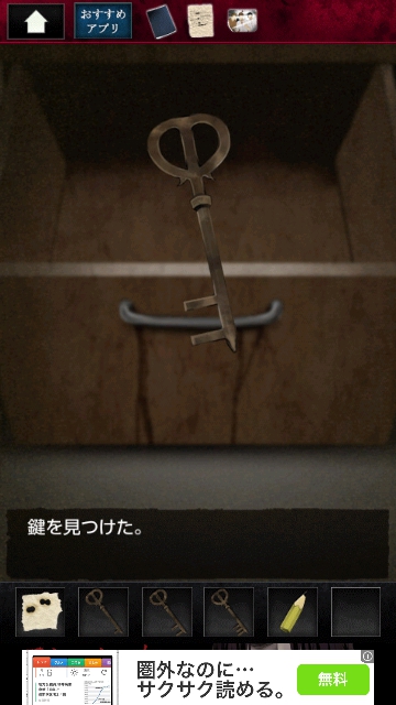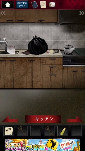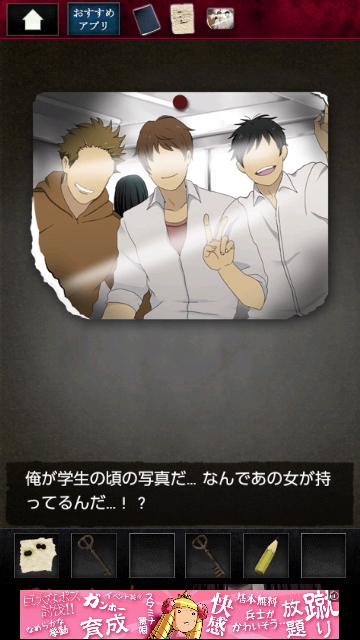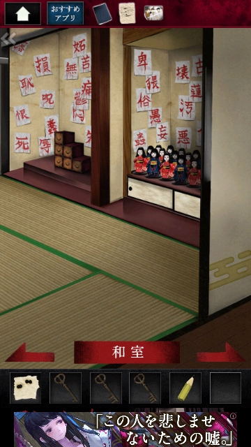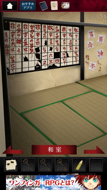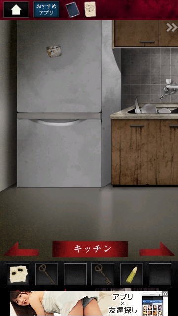ストーカー女からの脱出 グッドエンド その1 |Page4 脱出ゲーム 更新日時:2015年7月23日 1:53 AM ページタイトルとURLをコピーする リビングを通り、キッチンに移動します。 冷蔵庫になにか貼ってあります。 調べます。 写真です。手に入れます。 スワイプして黒いごみ袋の場所へ。 引き出しの3 団目をタップします。 開くと 右端に鍵があるので 3 つ目の鍵を取ります。 和室に移動します。 障子に文字がたくさんありますが ここの青い文字に注目です。 スワイプして棚と人形の画面へ。 棚を調べます。 障子の青枠の順で 1~6までタップします。 6 を再度タップすると 左にドライバーがあります。 ページ: 1 2 3 4 5 前ページへ 次ページへ SQOOLのYouTubeチャンネル スポンサーリンク