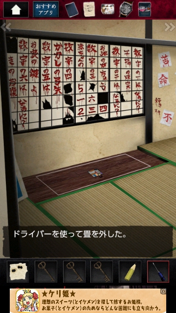 ストーカー女からの脱出 グッドエンド その2 |Page2 脱出ゲーム 更新日時:2015年7月23日 1:53 AM ページタイトルとURLをコピーする ドライバーを使って 開けます。 さらに調べると パズルになっています。 赤の丸いボタンに、鍵が入るように動かします。 以下、手順です。 解除されました。 しかし・・・ グッドエンド3 に続きます。 ストーカー女からの脱出 攻略記事一覧 ページ: 1 2 前ページへ SQOOLのYouTubeチャンネル スポンサーリンク