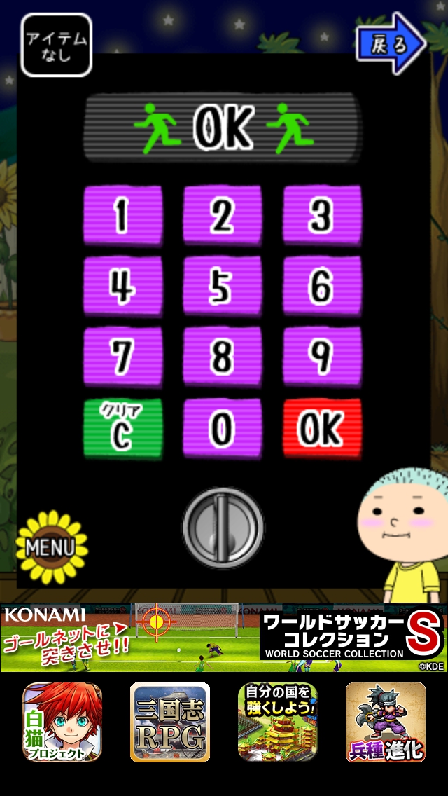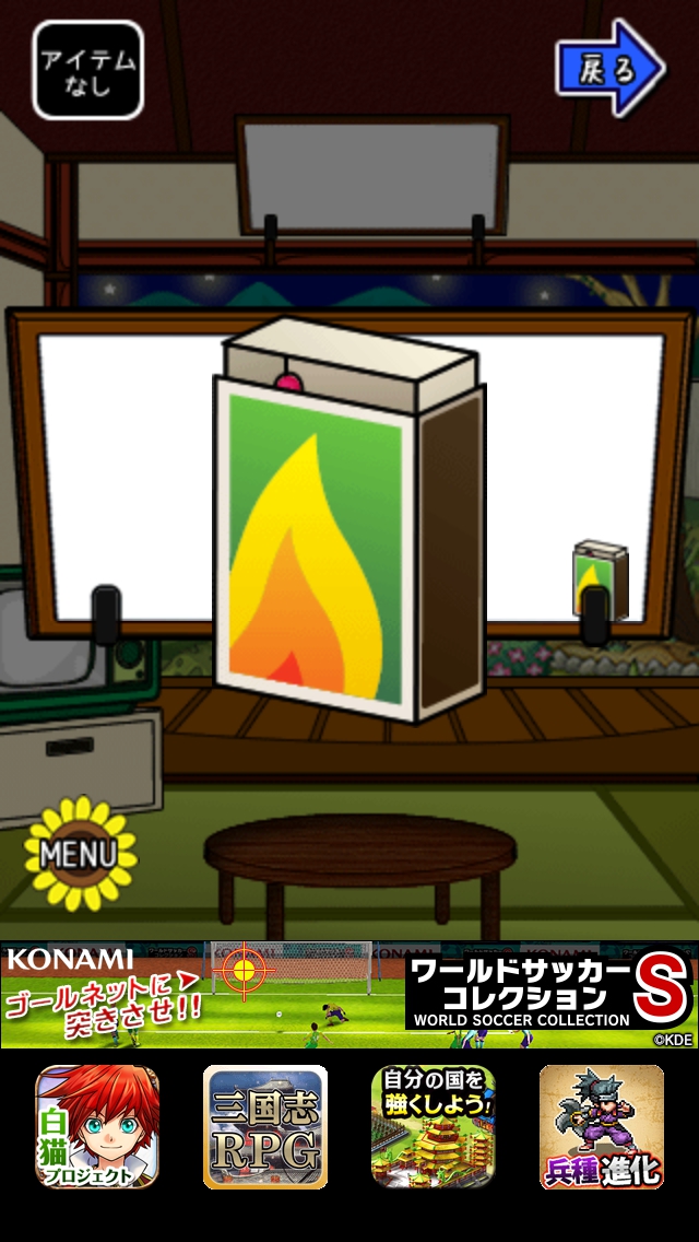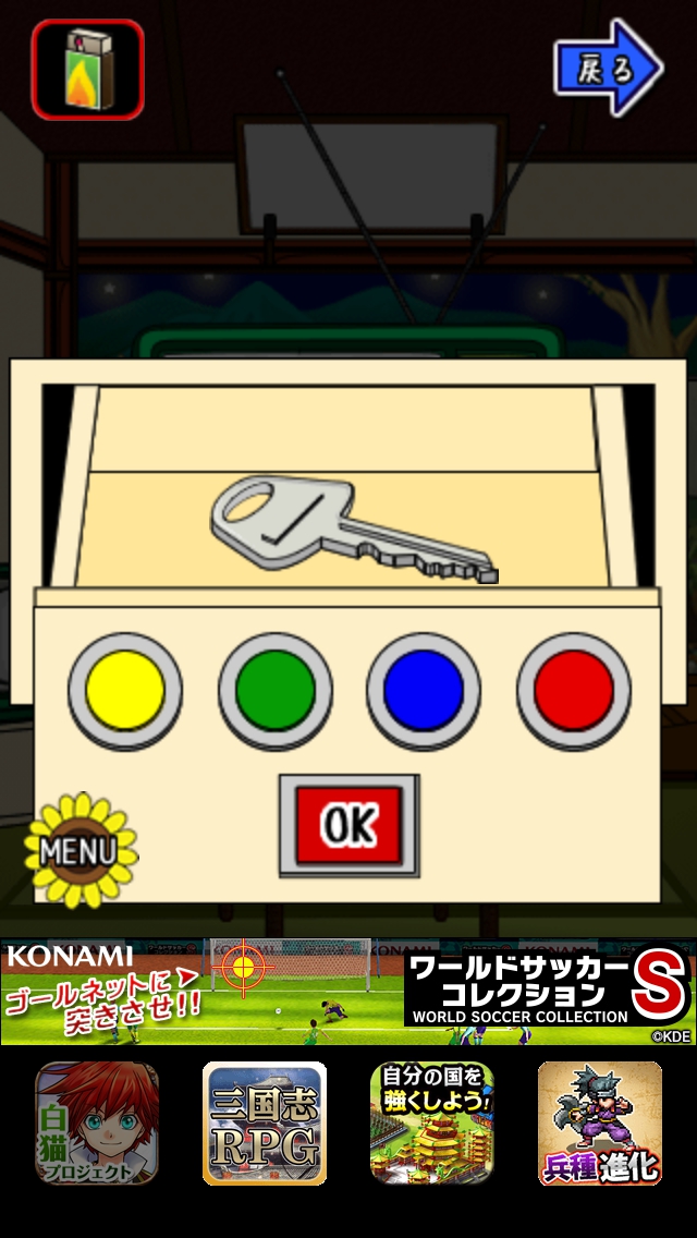 僕らの夏休み ステージ16~20 攻略|脱出ゲーム攻略 |Page2 脱出ゲーム 更新日時:2015年7月23日 1:53 AM ページタイトルとURLをコピーする ステージ17 部屋上の額絵を拡大します。 右下にマッチがあるので取ります。 出口側へ移動して、マッチで4人が持って いる線香花火に火を点けます。線香花火の 火が落ちる順番を色で覚えます。 黄→緑→青→赤 テレビ下の引き出しのボタンを先ほどの 線香花火の順にしてOKをタップします。 鍵を取ります。 出口扉の横の装置に鍵を差します。 扉が開くので脱出しましょう。 ページ: 1 2 3 4 5 前ページへ 次ページへ SQOOLのYouTubeチャンネル スポンサーリンク
