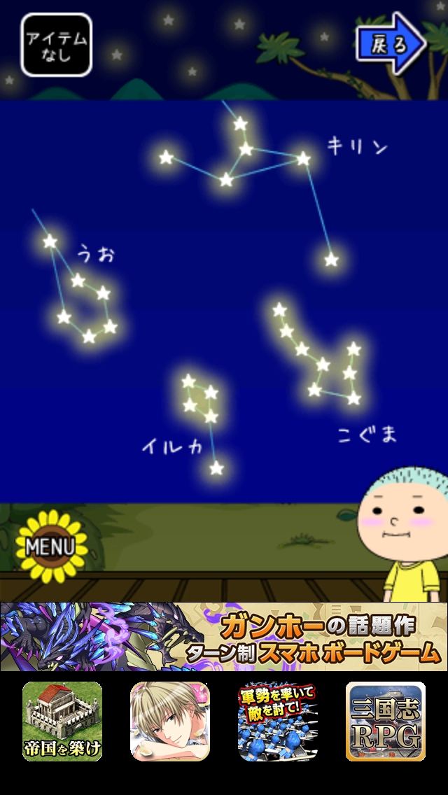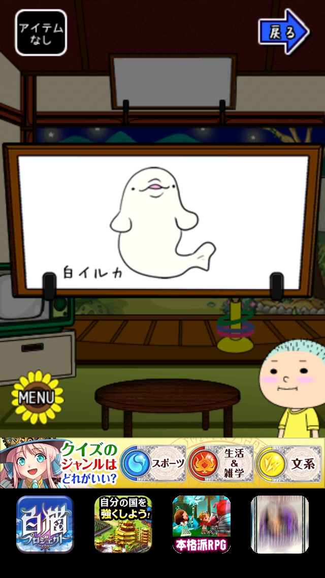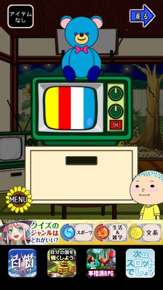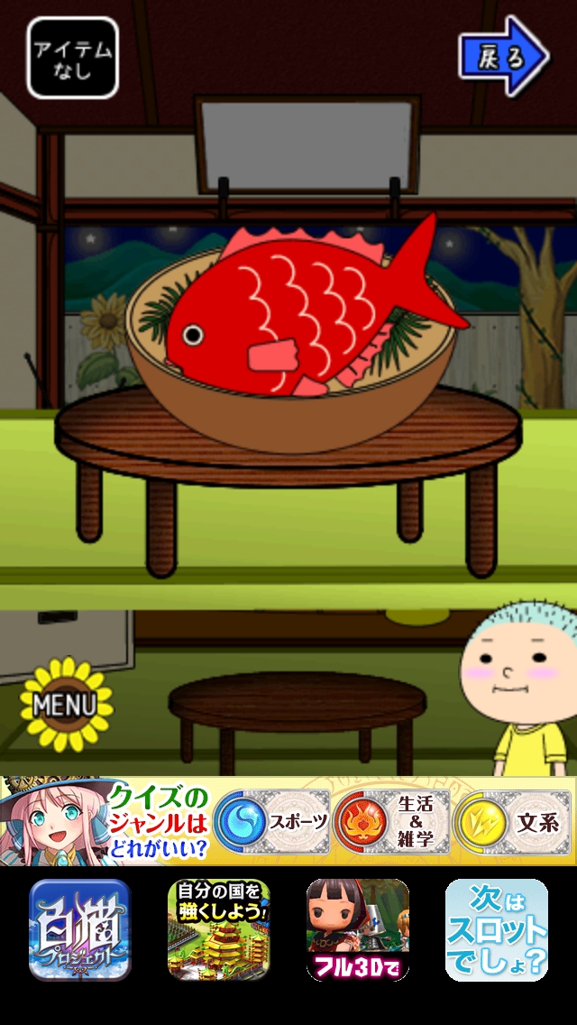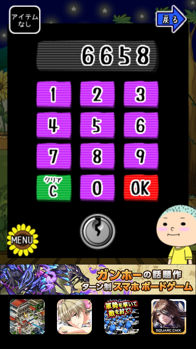 僕らの夏休み ステージ16~20 攻略|脱出ゲーム攻略 |Page3 脱出ゲーム 更新日時:2015年7月23日 1:53 AM ページタイトルとURLをコピーする ステージ18 テレビを見ます。画面に左から黄赤白青 の4色。上には青のクマのぬいぐるみが あります。 右側に黄色のキリンのおもちゃがあります。 ちゃぶ台の上に赤の魚があります。 上の額絵には白イルカが描かれています。 出口側へ移動して空を拡大します。 星の数を数え、テレビ画面の色順にします。 黄=キリン6 赤=うお6 白=イルカ5 青=こぐま8 出口扉の横の装置に6658と入力してOK をタップします。 扉が開くので脱出しましょう。 ページ: 1 2 3 4 5 前ページへ 次ページへ SQOOLのYouTubeチャンネル スポンサーリンク