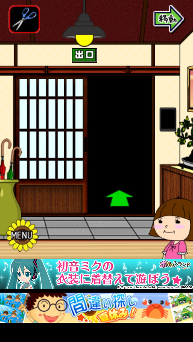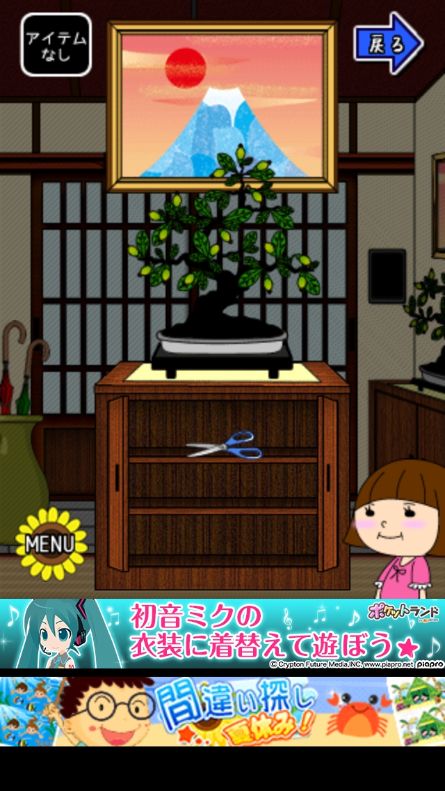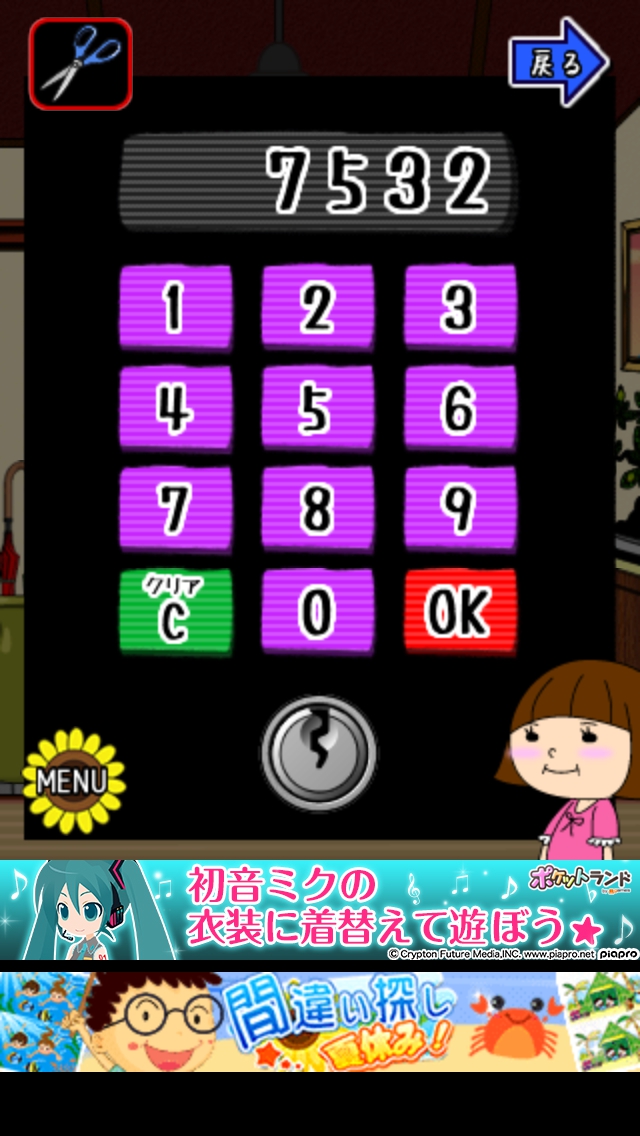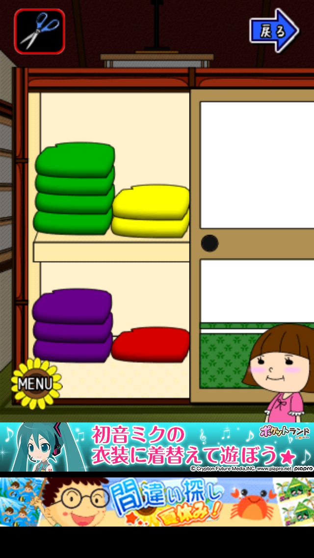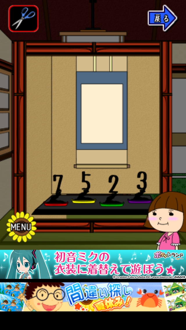 僕らの夏休み ステージ6~10 攻略|脱出ゲーム攻略 |Page3 脱出ゲーム 更新日時:2015年7月23日 1:53 AM ページタイトルとURLをコピーする ステージ8 玄関へ移動して右の靴箱の中のハサミをとります。 床の間の4つの盆栽をハサミでカットします。 赤の鉢7 黄の鉢5 緑の鉢2 紫の鉢3 と数字が出てきます。 床の間の右横のふすまを開けると4色の座布団 があります。赤1枚 黄2枚 紫3枚 緑4枚 鉢の順番を表します。 赤の鉢7→黄の鉢5→紫の鉢3→緑の鉢2 扉の横の装置に7532と入力してOKを タップします。 扉が開くので脱出しましょう。 ページ: 1 2 3 4 5 前ページへ 次ページへ SQOOLのYouTubeチャンネル スポンサーリンク