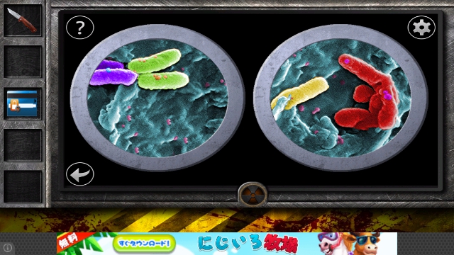 ウイルスの流行エスケープ Escape the Room EPDEMICS 攻略 レベル2|脱出ゲーム攻略 |Page2 脱出ゲーム 更新日時:2015年7月22日 12:12 PM ページタイトルとURLをコピーする 左のテーブルを拡大。 顕微鏡があるので・・・ ガラス瓶をセットして、覗くと (水色の目で見るところをタップ) 紫 緑 黄 赤 です。 ドアの右のボンベを拡大。 ボンベのパネルをさらに拡大。 顕微鏡で見た色の順番にタップで変えます。 紫 緑 黄 赤 戻ると ボンベの中に箱が現れるので 手に入れます。 ページ: 1 2 3 前ページへ 次ページへ SQOOLのYouTubeチャンネル スポンサーリンク