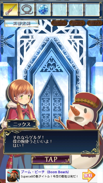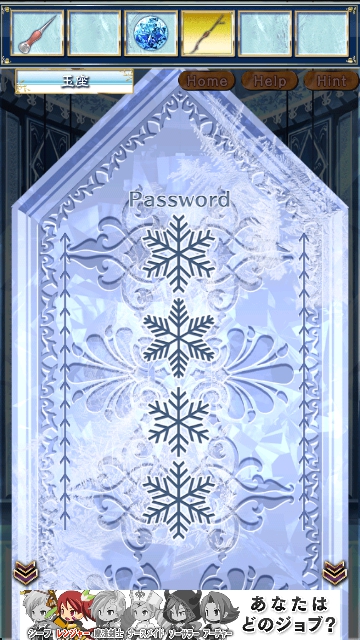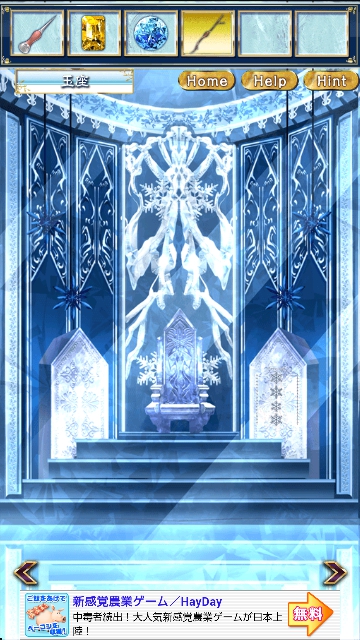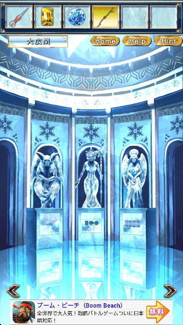 雪の女王と氷の城 ~童話脱出ゲーム~ ステージ4 攻略 |Page2 脱出ゲーム 更新日時:2015年7月22日 12:16 PM ページタイトルとURLをコピーする 上に黄色い宝石が見えますが 届きません。 正面玄関に移動して 雪ダルマ「ニックス」から枝を借ります。 再度、テラスに戻り アイテムの2本の枝とロープを 組み合わせます。 この長い枝をつかって 黄色の宝石を手に入れます。 玉座に移動します。 右の氷版に パスワードがあります。 大広間に移動します。 右の天使の台座を調べます。 ヒントがあります。 これが3なのは 色ごとにで3です。 線が貫いているかがポイントです。(黒) これが4なのは 色ごとに4です。 貫く線はありません。 ページ: 1 2 3 前ページへ 次ページへ SQOOLのYouTubeチャンネル スポンサーリンク