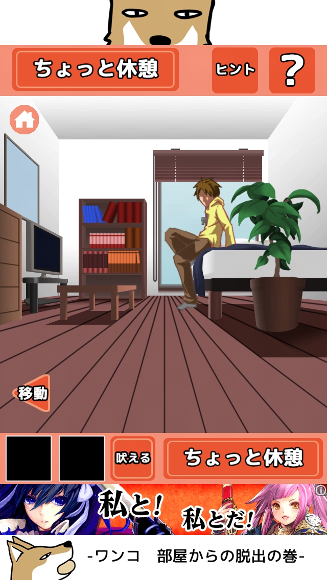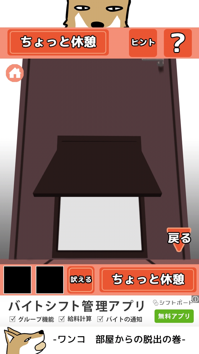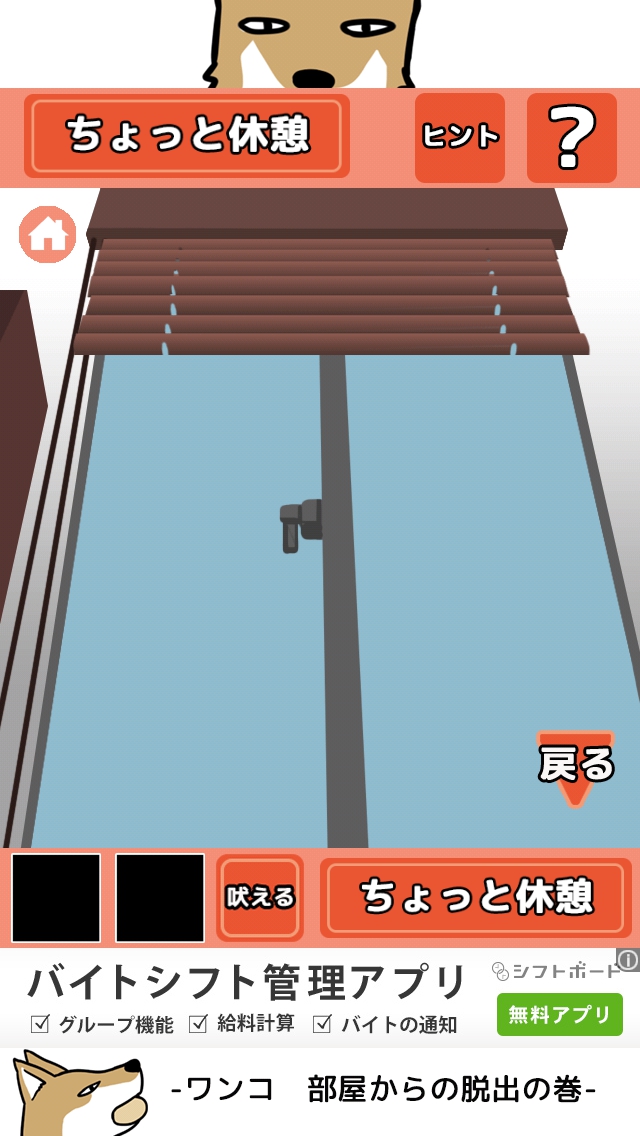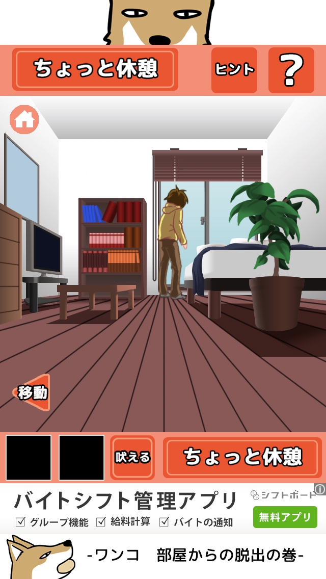ワンコ お部屋からの脱出の巻 攻略 ステージ 1~5 |Page5 脱出ゲーム 更新日時:2015年7月22日 12:16 PM ページタイトルとURLをコピーする ステージ5 画面右下の<移動>ボタンをタップして、 右の部屋へ移動します。 どうやらご主人様が怒っていて出られない ようです。部屋奥の窓の所をタップします。 窓の所で、画面下の<吠える>ボタンを タップします。 ご主人様の気がそれました。 左へ移動します。 ワンコ用の扉をタップして開きます。 脱出しましょう。 ステージ1 ステージ2 ステージ3 ステージ4 ステージ5 脱出ゲーム ワンコ お部屋からの脱出の巻 攻略記事一覧 ページ: 1 2 3 4 5 前ページへ SQOOLのYouTubeチャンネル スポンサーリンク