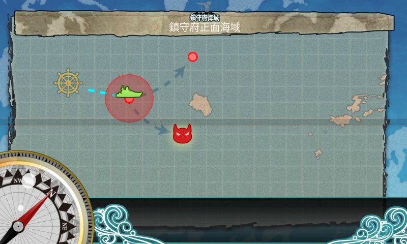 非常にシンプルですね。分かれ道が一つあるだけですが、艦これは自分で進む先を決めることは出来ません。羅針盤を回すことで進路が決まる完全にランダムです。(後々、特別な条件を満たすことでルートを固定できるMAPもある)
