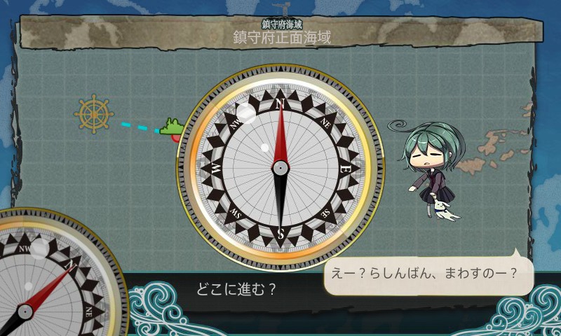 最初のマスをクリアすると、問題の分かれ道へ。分かれ道になるとこのように羅針盤が出現。クリックすると羅針盤娘が羅針盤を回します。