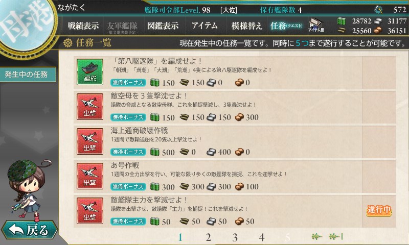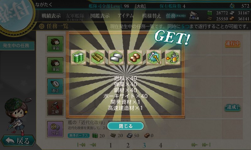 このように「遂行中」と表示されます。艦これをこういった任務を受けることが出来ます。そして、任務の条件を達成すると