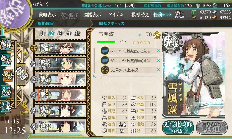 雪風、時雨を入れる場合は運が高いのを活かし、夜戦カットイン装備がいいでしょう。魚雷2、電探で。
