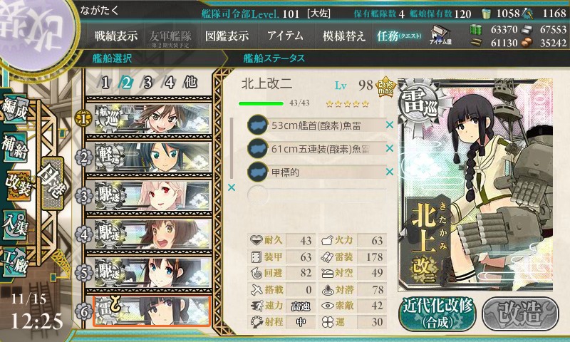 そして頼りになる雷巡は、先制魚雷の甲標的は確定。あとは連撃装備かカットイン装備かはお好みで。北上ではなく大井、木曾を選ぶ場合は連撃がいいと思います。