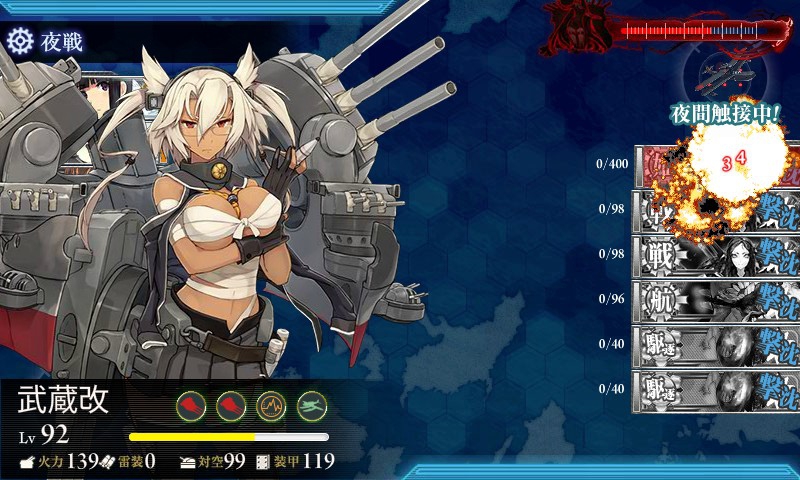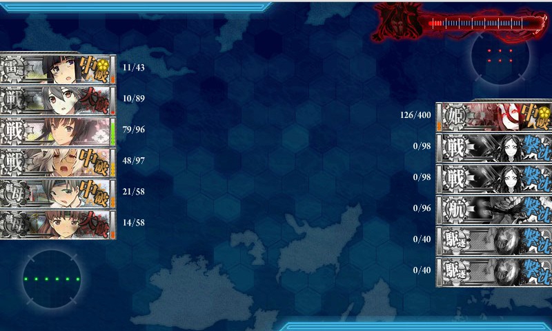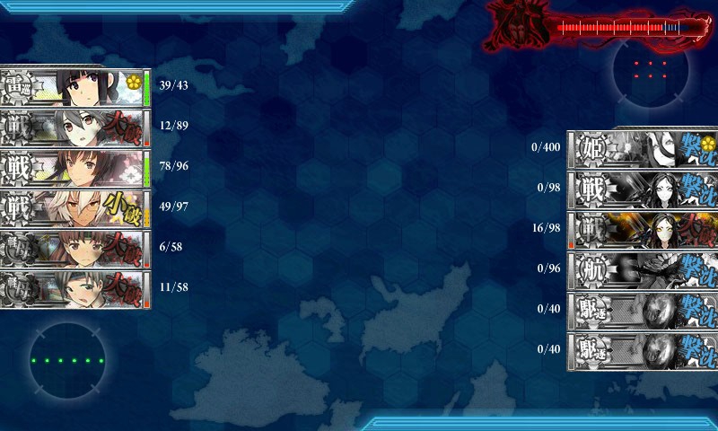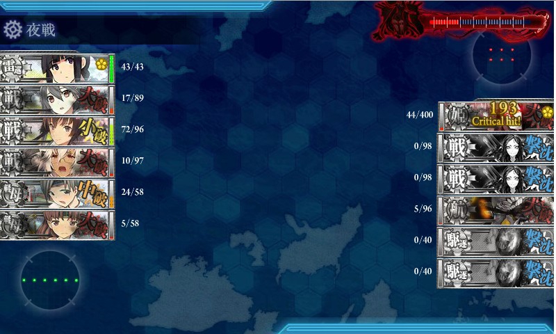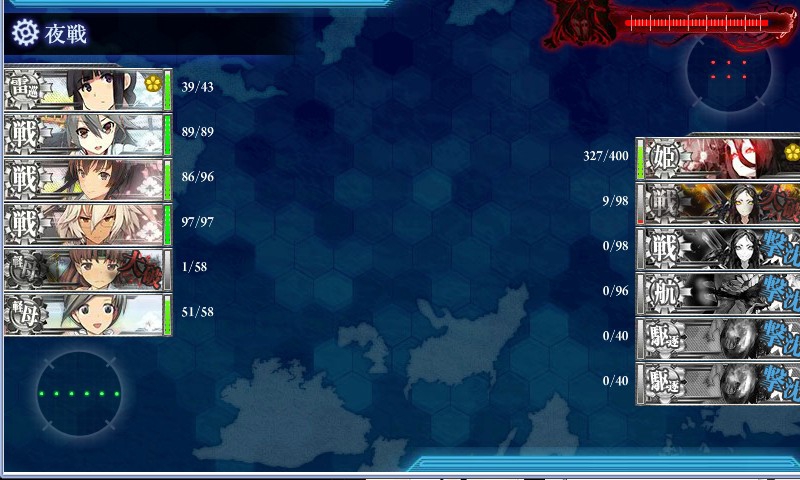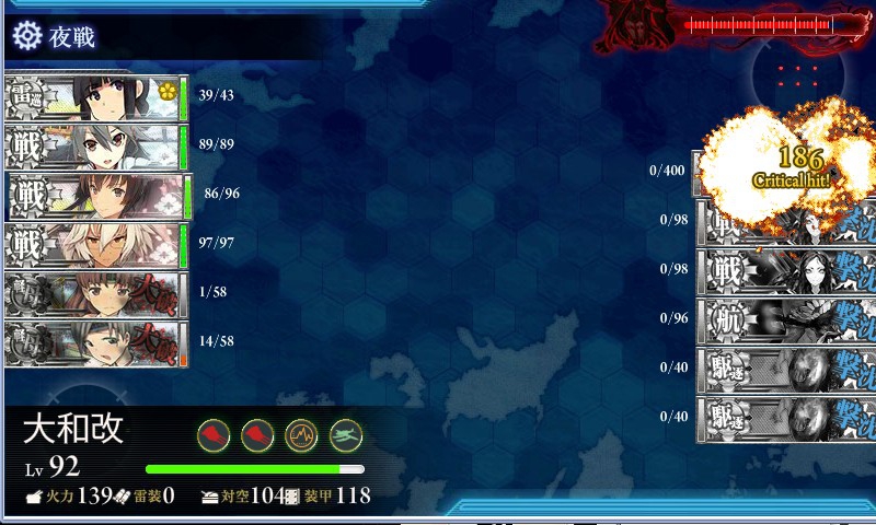 HPは400とかなり高め。昼で倒しきれることはまずないので、夜戦にかけます。ここでハイパー北上様の真価が発揮されます。北上様の夜戦火力は驚異的なもので、カットインが発動すれば(確率は約2分の1)HP400のボスすらもワンパンできるほどのダメージを与えることが出来ます。