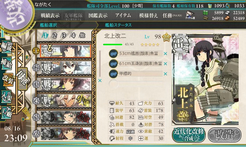 E6クリアに必須レベルの雷巡。特に北上であれば一番いいです。この北上にはまず、先制魚雷で敵を減らすため甲標的必須。そして夜戦で圧倒的火力をたたき出す可能性があるカットイン装備のため、魚雷を2つで確定です。